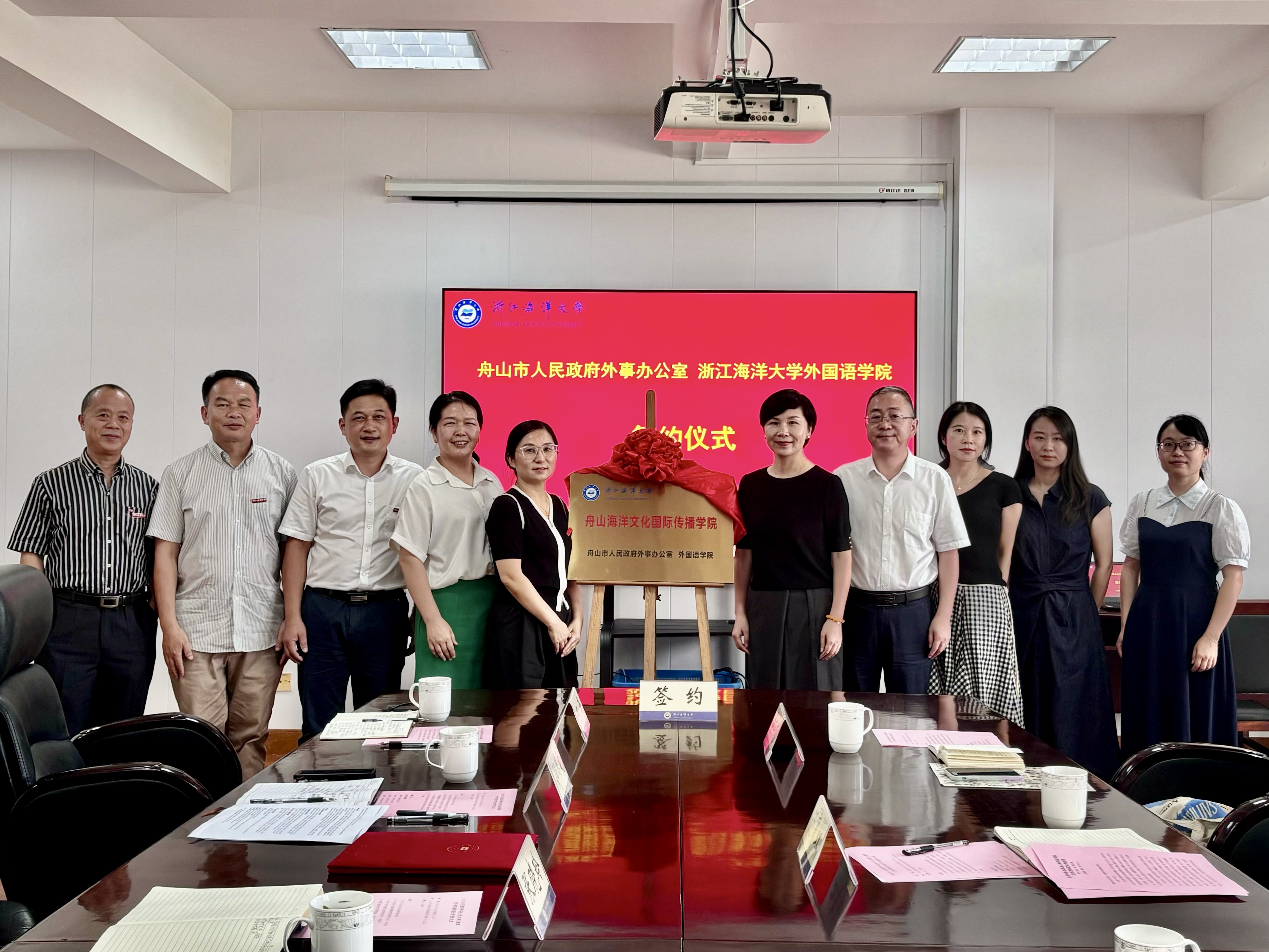 与舟山市人民政府外事办公室共同举办合作签约仪式,联合共建舟山海洋文化国际传播学院。市外办主任汤赛虹与学校教务处副处长张晓玲共同为学院揭牌。外办副主任庄海波、做爱视频
