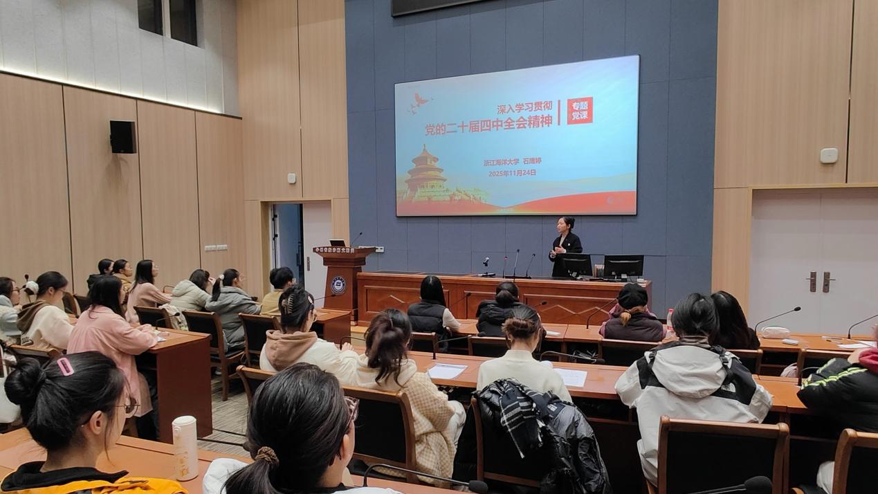 党委邀请浙江省“新时代真理的味道”青春宣讲团、舟山市“新潮声”理论宣讲团、学校“海潮·8090”理论宣讲团成员、学院学工办石鹰婷老师,面向全院学生党员开展专题党课学习,引导学生党员深刻领会全会精神实质,将理论学习与专业发展、实践服务相结合。