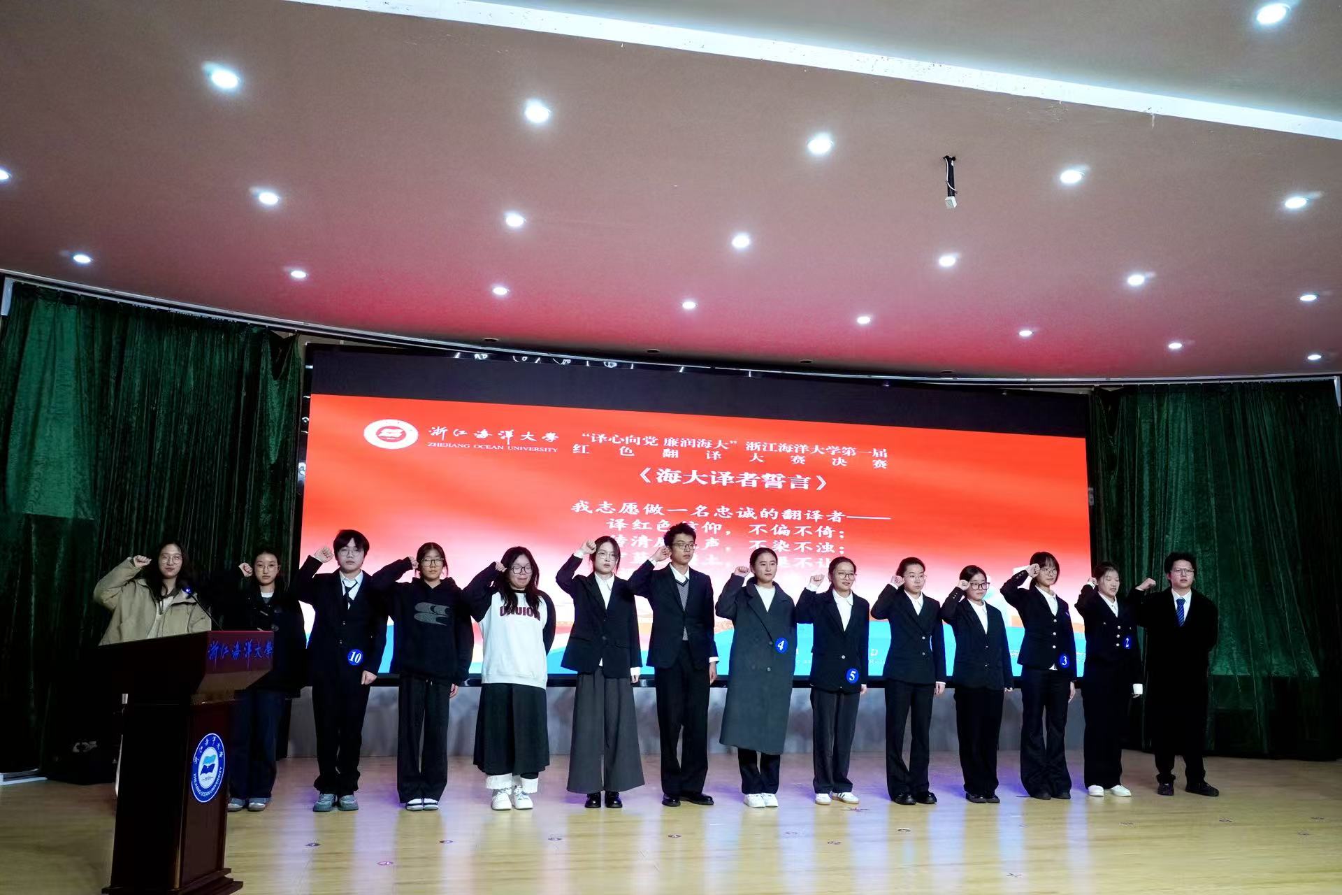 闭幕式上,全体获奖选手共同宣读《海大译者誓言》:“译红色信仰,不偏不倚;传清廉之声,不染不浊;守蓝色疆土,不退不让……”铿锵誓言在会场回荡,彰显了海大学子作为文化传播者的责任与担当。