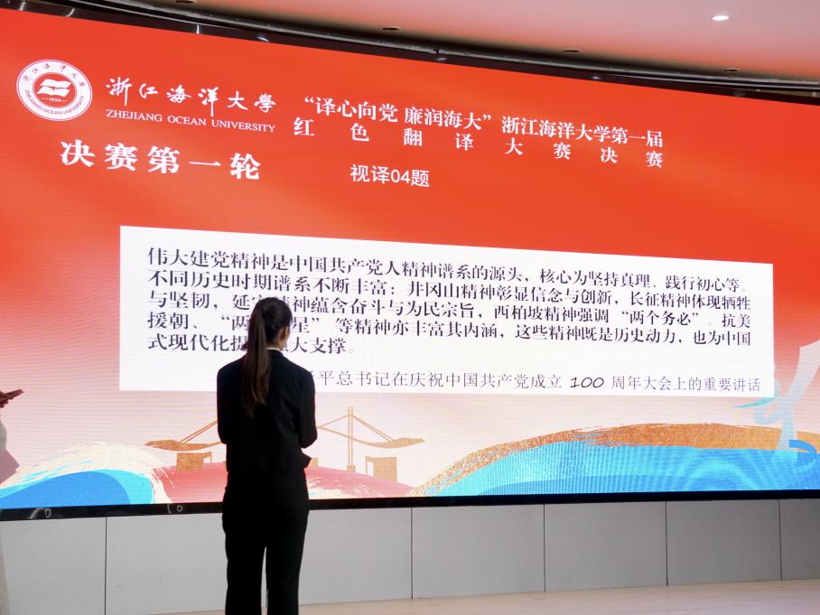 党委、纪委承办,作为“蓝色领航·海大清风”第三届廉洁文化节的收官重头戏,以语言为桥搭建起跨文化思政育人平台,让红色精神、清廉之风与海洋情怀在双语传译中深度交融。学校党委委员、纪委书记、省监委驻校监察专员卢理明,各职能部门及二级学院相关负责人,舟山市翻译协会专家与校内师生代表共同见证这场语言与信仰的双重盛宴。