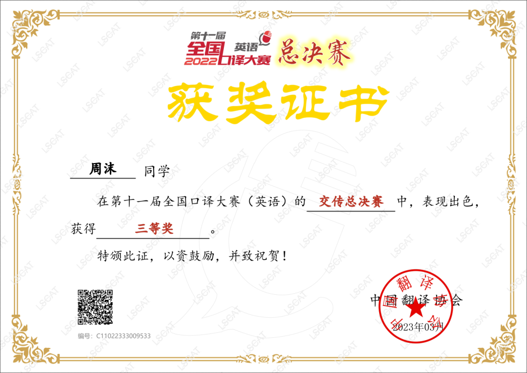周沫同学自参加第十一届全国口译大赛(英语)以来,在每场比赛中都稳打稳扎、表现出色,最终在激烈角逐中获得优异成绩。
