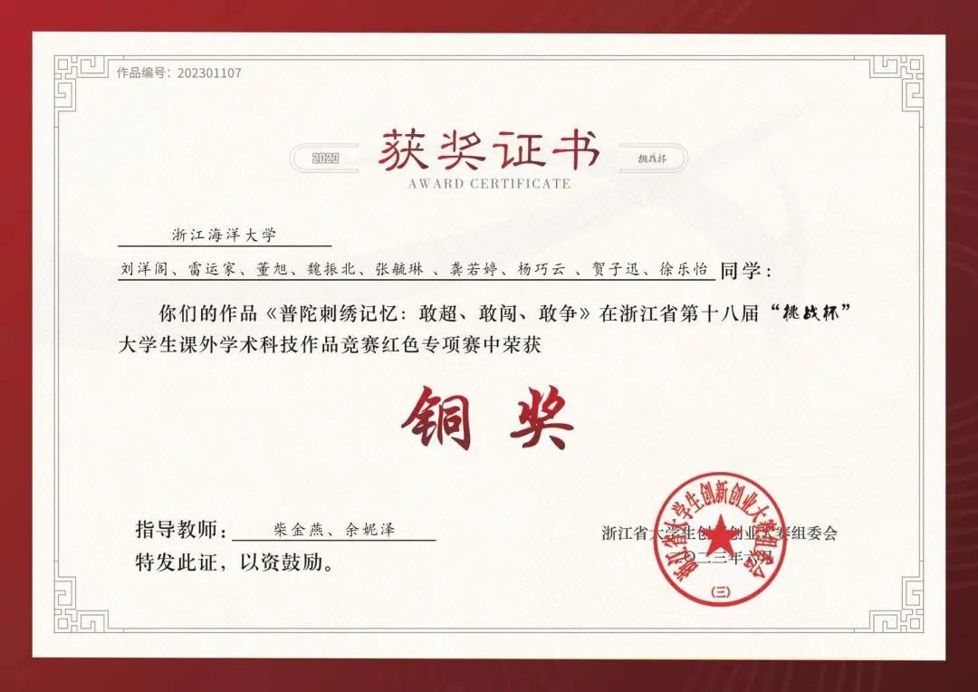 普陀刺绣“色彩艳丽、针法细腻”,因其独特的海岛风情、美丽的海岛神话以及精美的绣工而为人称道,是舟山传统文化之宝,是珍贵的舟山非物质文化遗产。从历史轨迹看,普陀刺绣是一部充满生机活力、彰显海岛人民“敢”超自我的发展史。从文化底蕴看,普陀刺绣在海岛渔嫂中有着深厚的感情基础,彰显了海岛人民敢闯的传承史。从精神动力看,普陀刺绣元素是海岛渔村精神的具体化,始终激励海岛人民敢争一流的奋斗史。传承好普陀刺绣内涵,是青年一代赓续红色血脉,忠实践行“八八战略”,奋力打造“重要窗口”的题中应有之义。实践团成员先后赴革命老区普陀展茅、军事博物馆、城市展览馆、名人馆、定海民俗馆、全国第一个公社普陀“蚂蚁岛”等地进行学习调研、人物专访,深刻挖掘普陀刺绣蕴含的红色基因,体悟刺绣红色文化,感受党的红色精神伟力。