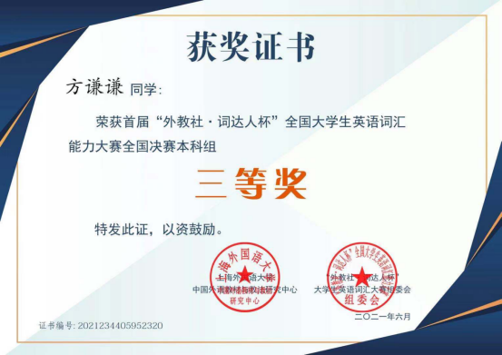 2021年“外教社·词达人杯”全国大学生英语词汇能力大赛中,做爱视频 蔡媚媚、柯懿倩、方谦谦、巩琳等同学为院争光,在浙江赛区乃至全国大赛中取得了傲人的成绩。