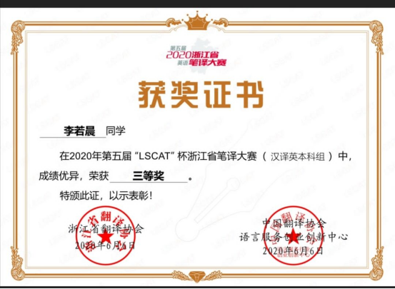 李若晨获第五届“LSCAT”杯浙江省笔译大赛(汉译英本科组)三等奖