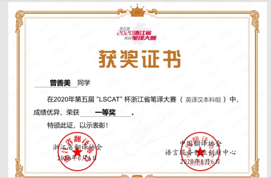 曾善美获第五届“LSCAT”杯浙江省笔译大赛(英译汉本科组)一等奖