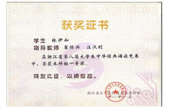 林伊如获浙江省第八届大学生中华经典诵读竞赛(本科组)一等奖