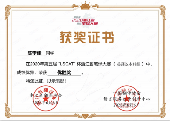 陈李佳获第五届“LSCAT”杯浙江省笔译大赛(英译汉本科组)优胜奖