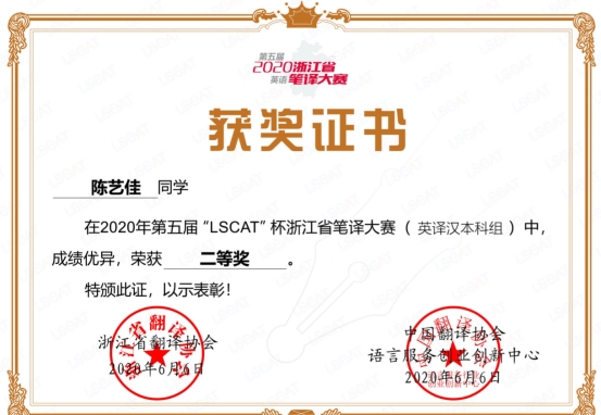 陈艺佳获第五届“LSCAT”杯浙江省笔译大赛(英译汉本科组)二等奖