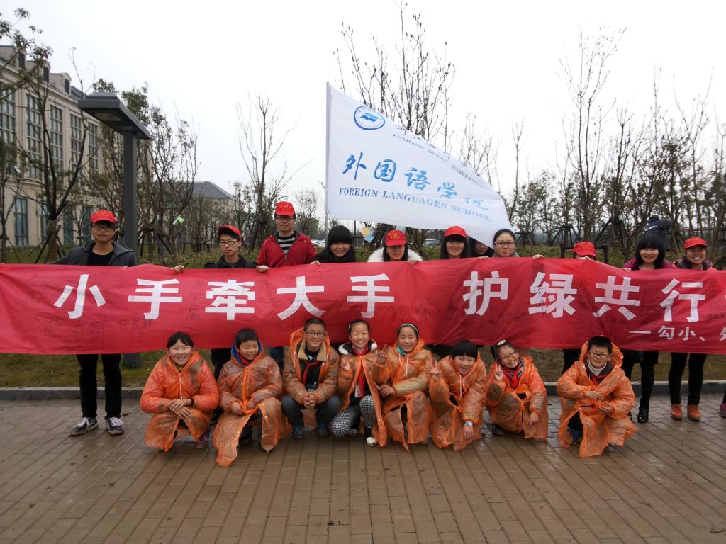 的志愿者们在海院正门处顺利汇合,在外院老师的带领下前往图书馆西南面的一块绿地上开始植树活动。活动中,勾山小学的带队老师耐心的向小朋友们讲解植树的工具以及将要种植的树的名称。小朋友们跃跃欲试,套上雨衣开始植树活动,无奈人小力弱,一旁热心的志愿者们纷纷上前帮忙。植树现场和谐友爱,热火朝天。植树完毕,小朋友们不顾自己鞋子上的泥迹,纷纷掏出自己精心制作的牌子给树系上,并与现场的老师、志愿者们在横幅上签上自己的名字。最后,参与植树的全体人员在种下的树前合影留念,在镜头上留下了最灿烂的笑容。