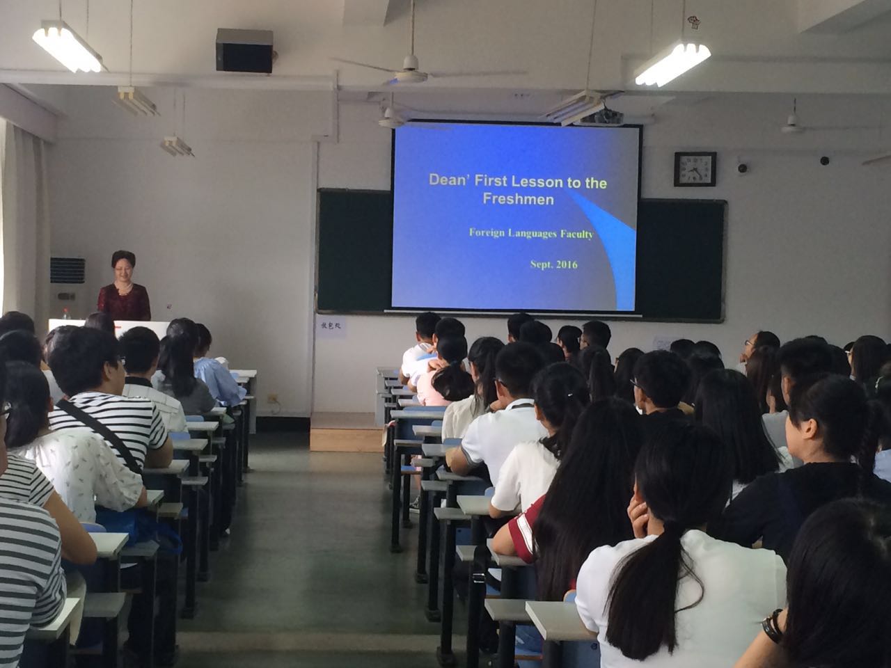 首先,蔡院长向16级新生表达了欢迎,简单介绍了学院的师资力量、优秀成绩和组织架构等。然后提出 “为什么上大学、如何上大学、大学毕业后准备做什么”这三个问题和学生讨论,启迪学生上大学后依然要勤奋,懂得自主学习并要根据实际情况设定目标,在大学四年中逐渐养成良好的思维方式和生活习惯。最后向新生提出了几点要求,希望同学们端正动机,尽快适应大学生活,锲而不舍地去追寻自己的目标。台下学生们反应热烈,为院长流利的英文和深入浅出讲话所吸引。院长第一课,为16级新生的大学生活指明了正确航向,期待着16级新生们在海大扬帆起航,开启新篇章!