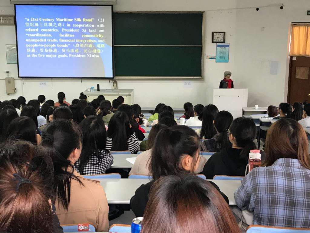 讲座开始,方教授向大家介绍了学习英语的目的和英语这门语言在国际上的运用价值。方教授流利的口语和全英文的PPT展示不仅给本次讲座增添了色彩,更向学生们展示了英语精通者的个人魅力。同时,她也结合当下热点“21世纪海上丝绸之路”和“一带一路”向学生们说明了学习英语的重要性和必要性。方教授发言完毕,学生们报以热烈的掌声。