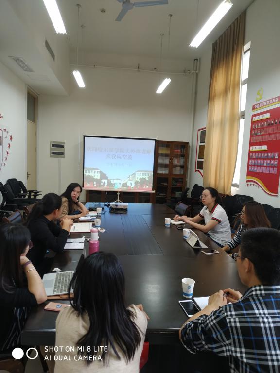 10月30日下午,哈尔滨学院大学外语部主任梦红、大学外语部教研室主任李墅钰一行来做爱视频 调研。学院副院长汤艳、大外部主任郑雯嫣及其他骨干教师参加了研讨会。在会上,汤副院长首先向哈尔滨学院的老师们介绍了我校大学英语多样化教学机制的发展现状和相关经验。随后,双方就大学英语智慧课堂、四六级的考教模式、大学英语的“应用型”办学等问题进行了深入的探讨。双方教师们积极交流,气氛热烈融洽。