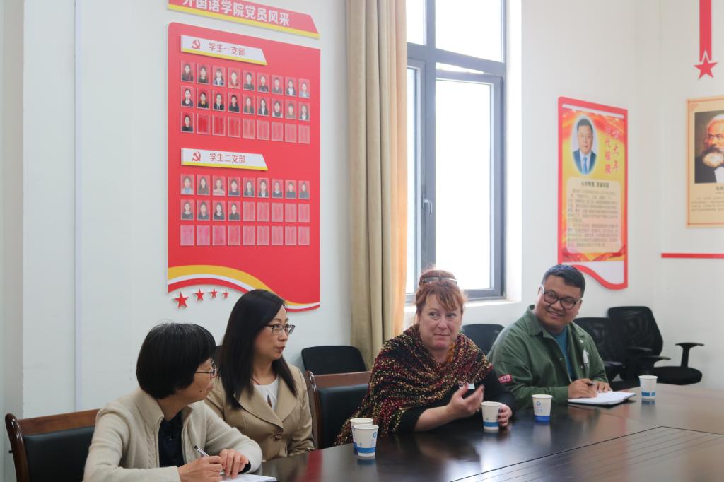 会议室会见了来访客人并进行深入交流。大学英语教研室主任郑雯嫣、陆国飞教授及学院年青教师代表参加了此次交流会。