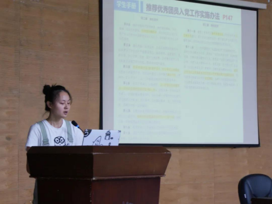 最后,柴金燕老师为学生们讲解了学生手册中推优入党和第二课堂学分的重要内容,介绍了团学组织集体和个人荣誉称号授予办法、学生社团管理办法、学生志愿服务管理方法、本科学生创新创业实践学分实施方法、学生学科竞赛管理办法、大学生创新训练计划项目管理办法等内容,鼓励学生发掘自身特长,大胆创新,勇于表现自己,在各种活动中获得成长。