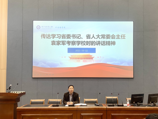 翁志军教授的讲座后,学院党委书记许金权传达学习了省委书记、省人大常委会主任袁家军考察学校时的讲话精神。