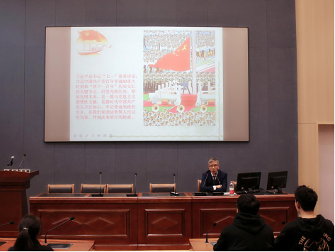 其次,翁志军教授向师生党员系统地回顾了中国共产党走过的光辉历程。通过多个重要会议和重要节点逐次展开,从“小康社会”到“中国梦”,中国共产党团结带领中国人民,浴血奋战、百折不挠,一步步向着为人民谋幸福、为中华民族谋复兴这一初心使命和长期目标奋进。
