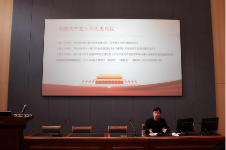 方老师先简单介绍了十九届六中全会的过程与内容,本次大会主要通过了《中共中央关于党的百年奋斗重大成就和历史经验的决议》、《关于召开党的第二十次全国代表大会的决议》两个议案。纵观党的百年辉煌历史,中国共产党的三个历史性决议耦合于“站起来”,“富起来”,“强起来”的三次历史性飞跃。而总结党的百年奋斗的重大成就和历史经验,是开启全面建设社会主义现代化国家新征程、在新时代坚持和发展中国特色社会主义的需要,也是确保全党步调一致向前进,推进党带领全国各族人民为实现中华民族伟大复兴的中国梦而继续奋斗的需要。