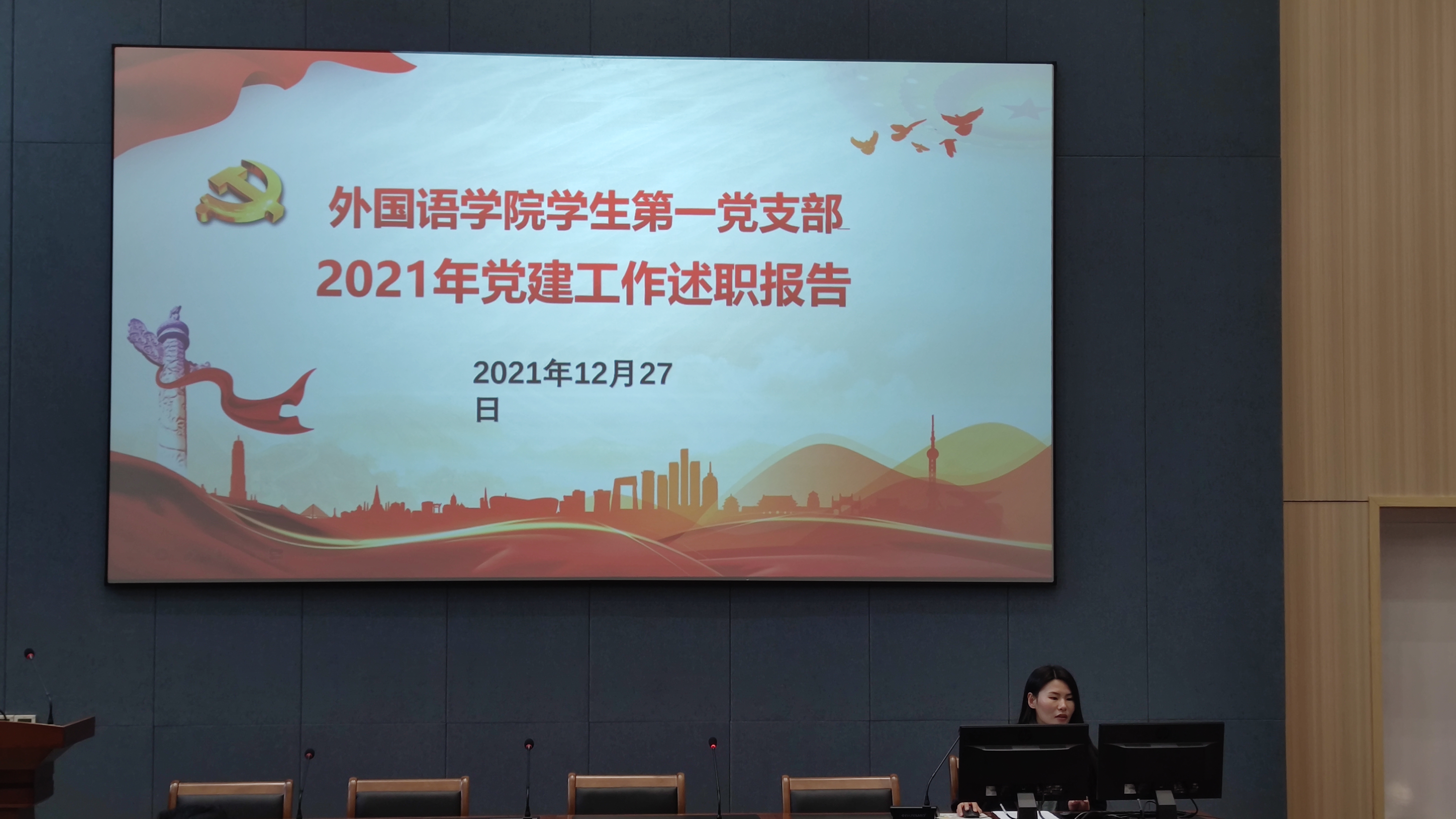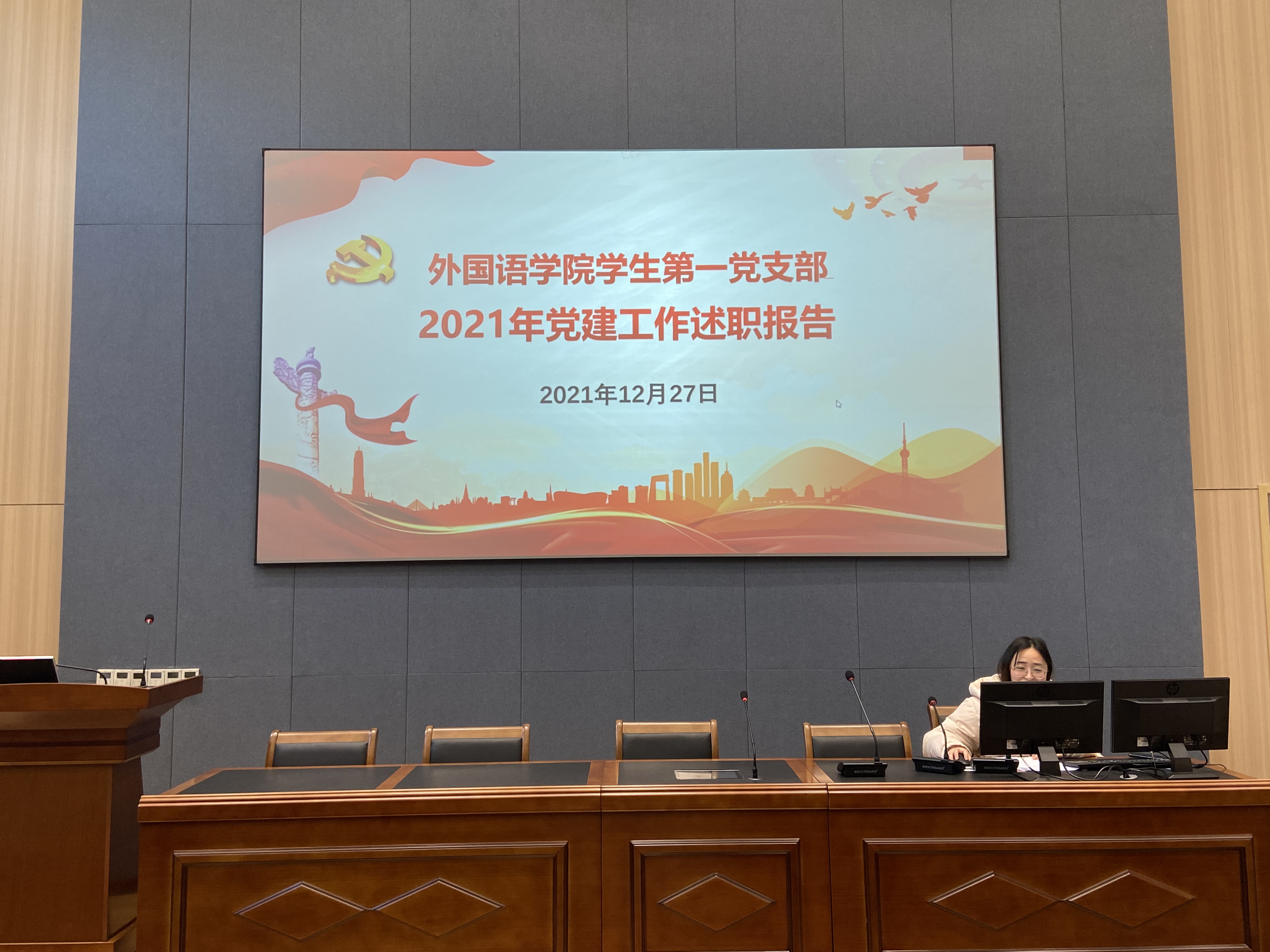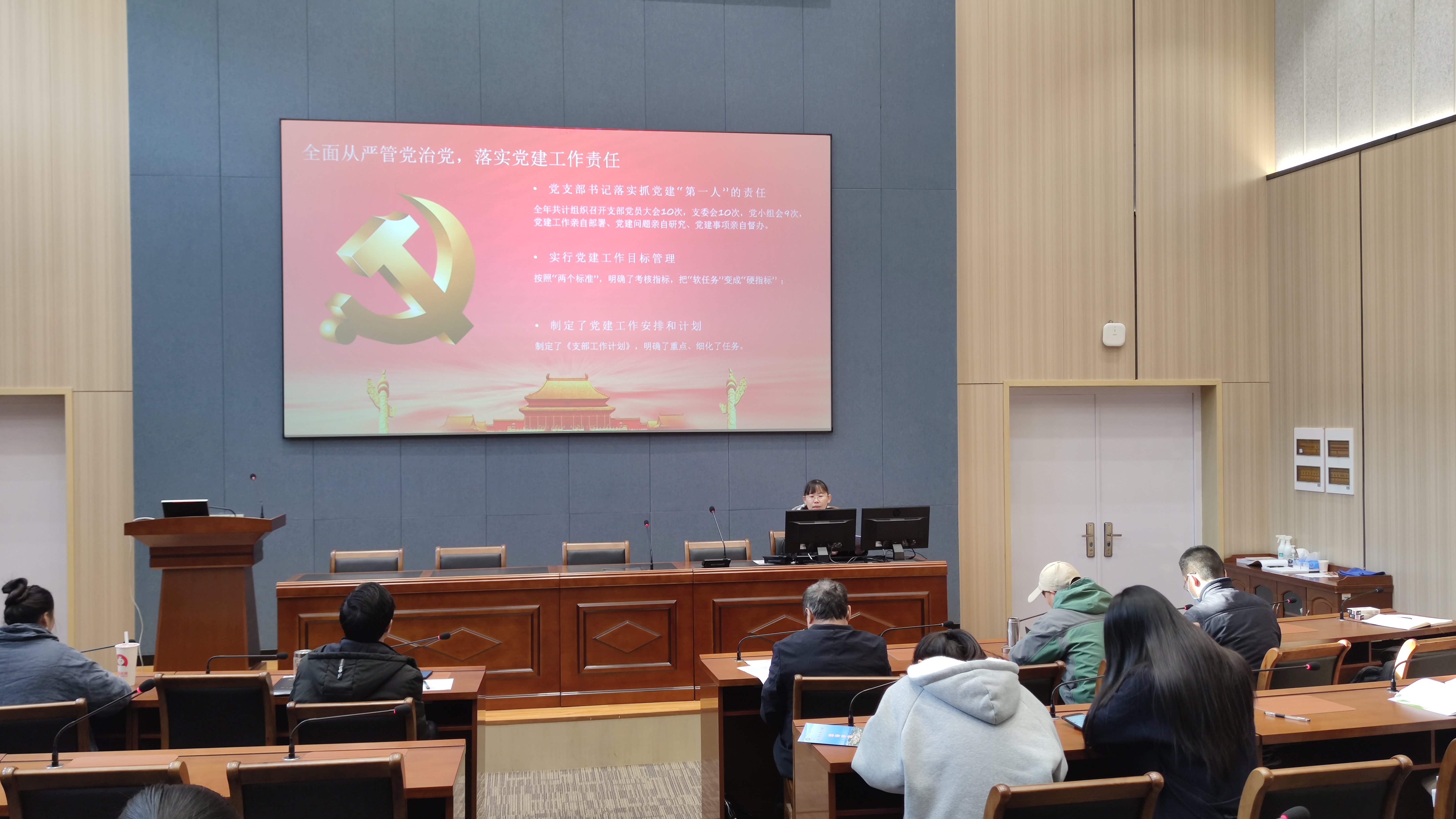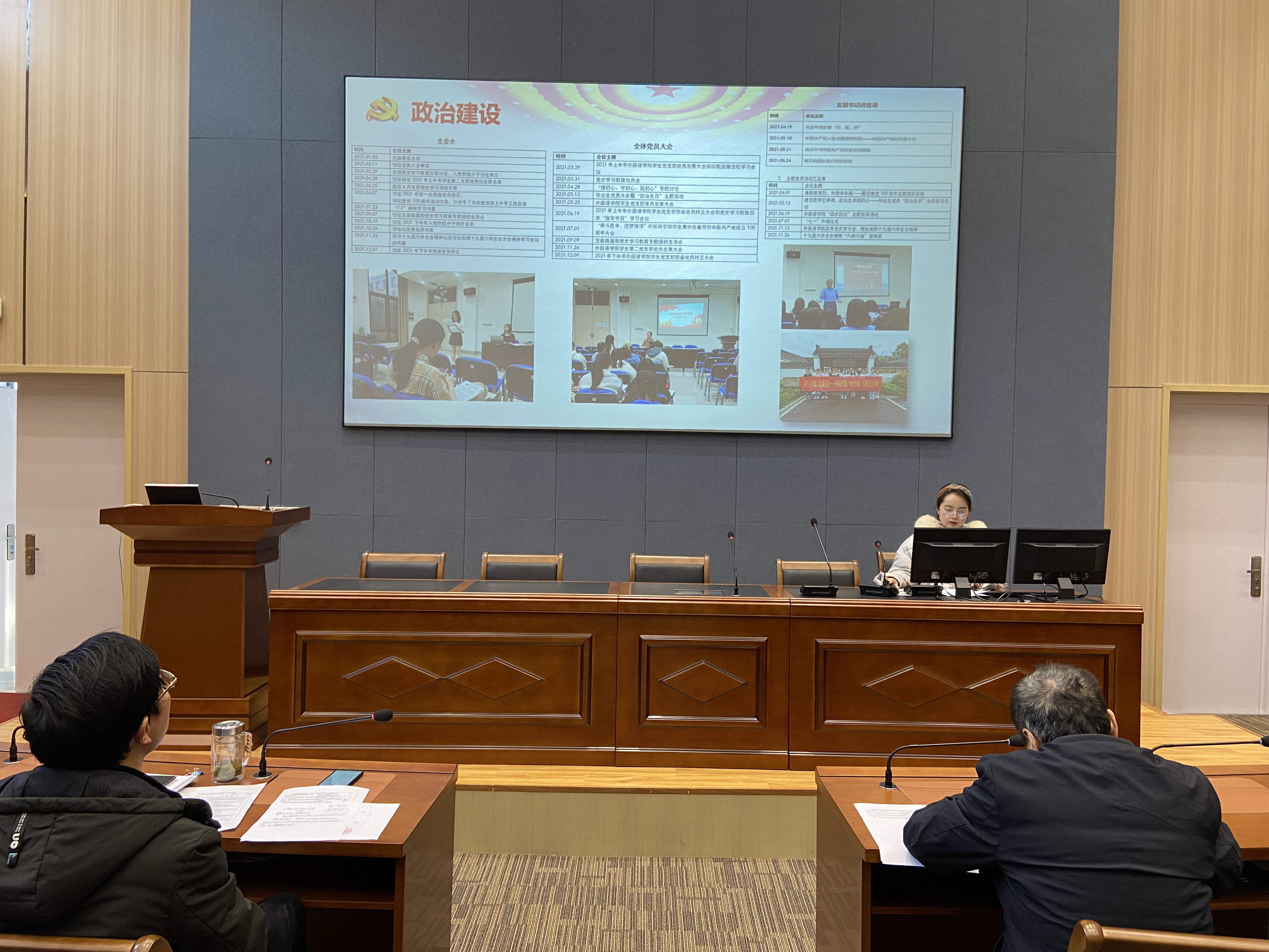 接着,四个支部进行年度述职。教工一支部书记张贝、教工二支部书记文接力、学生一支部书记余妮泽、学生二支部书记王逸菲分别对各自支部的工作情况、仍然存在的问题以及对未来的展望进行了汇报总结。各位教师党员以及在场的各班学生代表随后根据各支部述职情况进行了满意度测评。