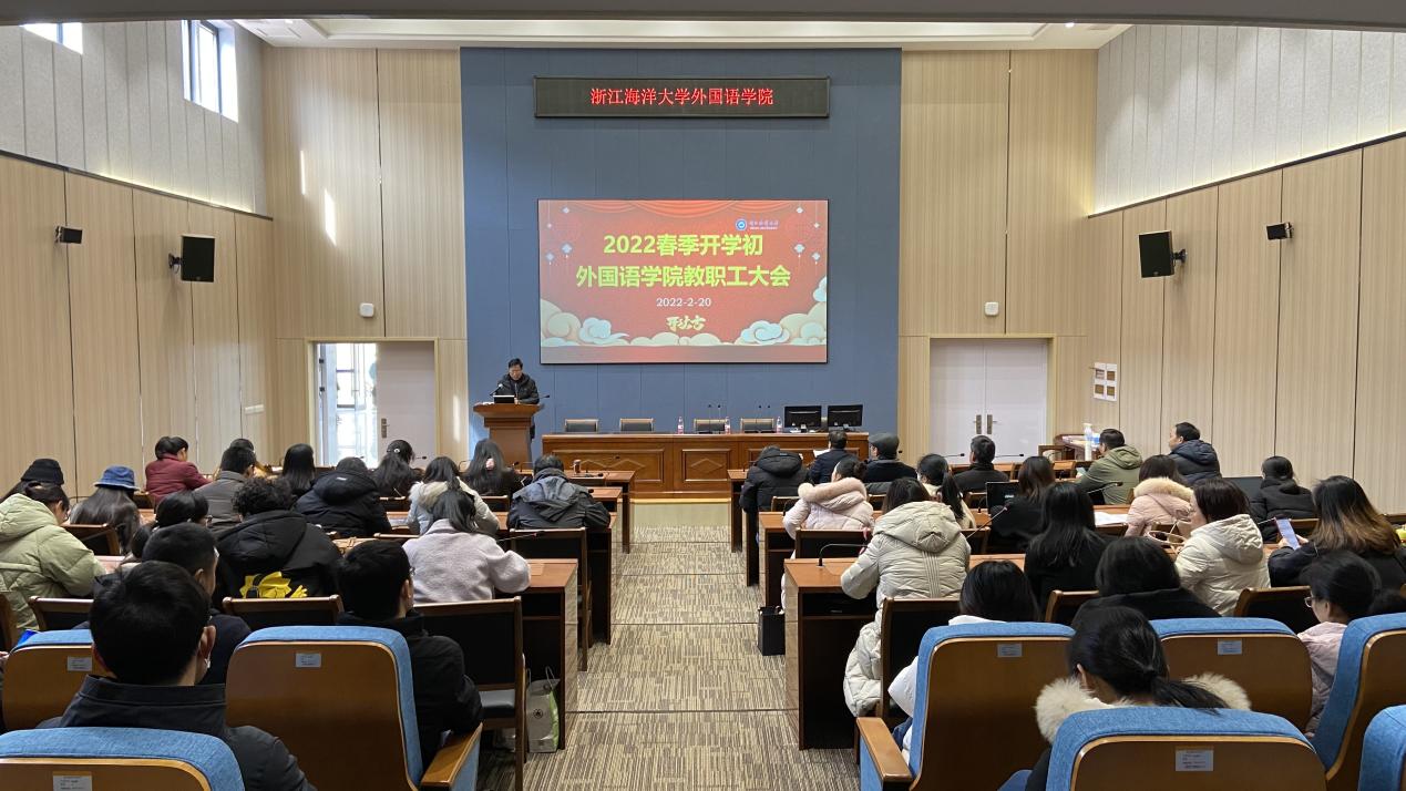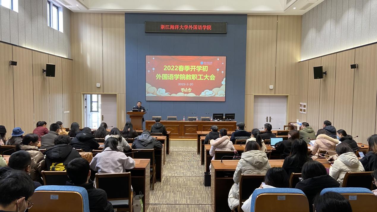 在公共教学楼120同传实验室召开2022年春季开学初全体教职工大会。学院党委书记许金权主持会议,学院党政领导班子、全体教职工参加会议。