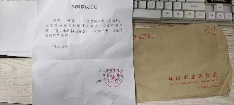 老板娘报警并将该包交于定海区环南派出所,派出所警务人员在查验包内物品时,发现了一张化名为“十方”,关于舟山市慈善总会的“书循环、善循环”希望工程项目的爱心图书捐赠证明。