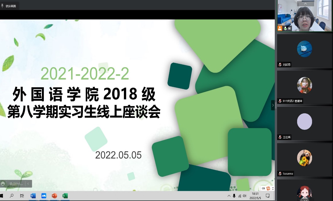 召开2021-2022学年第2学期线上实习生座谈会,教学副院长汤艳,英语系正副主任(刘起昂、解建慧),英语师范教学与实践相关教师(刘夏芬老师、李红英老师、王佳瑶老师、李祥玉老师)和2018级第八学期实习的师范生参加本次腾讯会议。