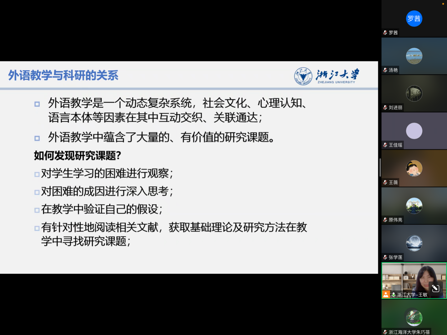 教师云端相聚,进行题为“基于互动协同的大学外语教学与研究:理论与方法”的专题报告。 王敏教授从一线外语教师们所关心的外语学习的根本问题出发,就“什么是互动协同”、“协同与二语习得有何关系”、“如何在外语教学中应用互动协同”等问题,分享了她的研究与心得。如何从课堂中发现研究选题,如何平衡教学与科研等问题一直是青年教师们的困惑所在,王敏教授的精彩报告给了大家不少启发,也激发了老师们的教学与科研热情。