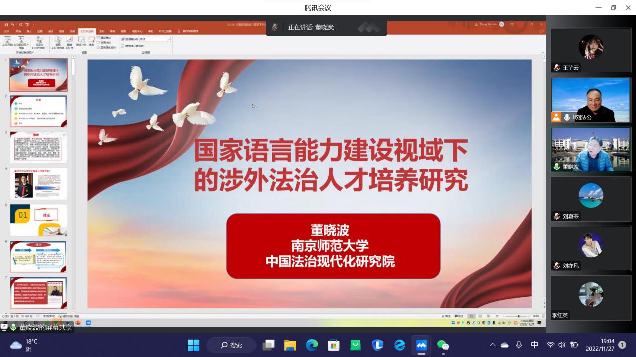 邀请南京师范大学董晓波教授进行了“国家语言能力建设视阈下的涉外法治人才培养研究”的专题讲座。刘法公院长主持讲座,外院全体教师参加讲座。