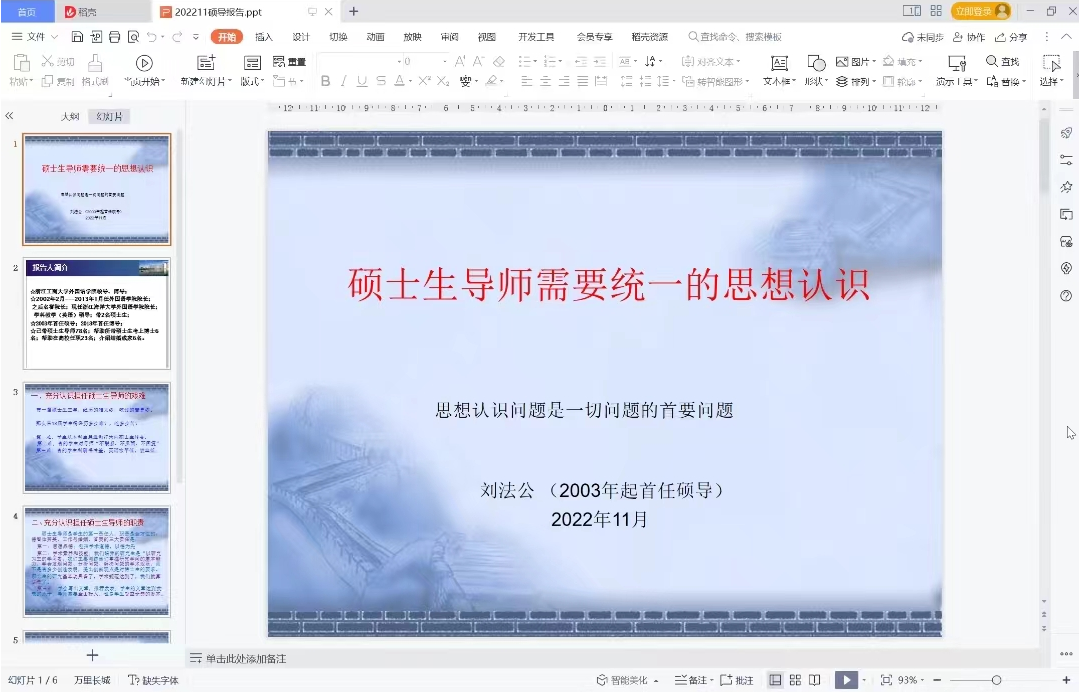 培训中,刘院长首先指出了需要统一的思想认识问题,即担任硕士生导师的艰难、责任与贡献。接着描述了学术论文写作起步的四部曲,尤其强调了选题的重要性,并举出了相关不当选题与恰当选题的实例,表明论文写作的选题必须具有问题意识。最后,刘院长就文献梳理与使用这一方面展开,从文献梳理、文献使用、论证、论文修改与查证、文献修改、结尾论文与学术不端这几个角度分别作了详尽阐述。