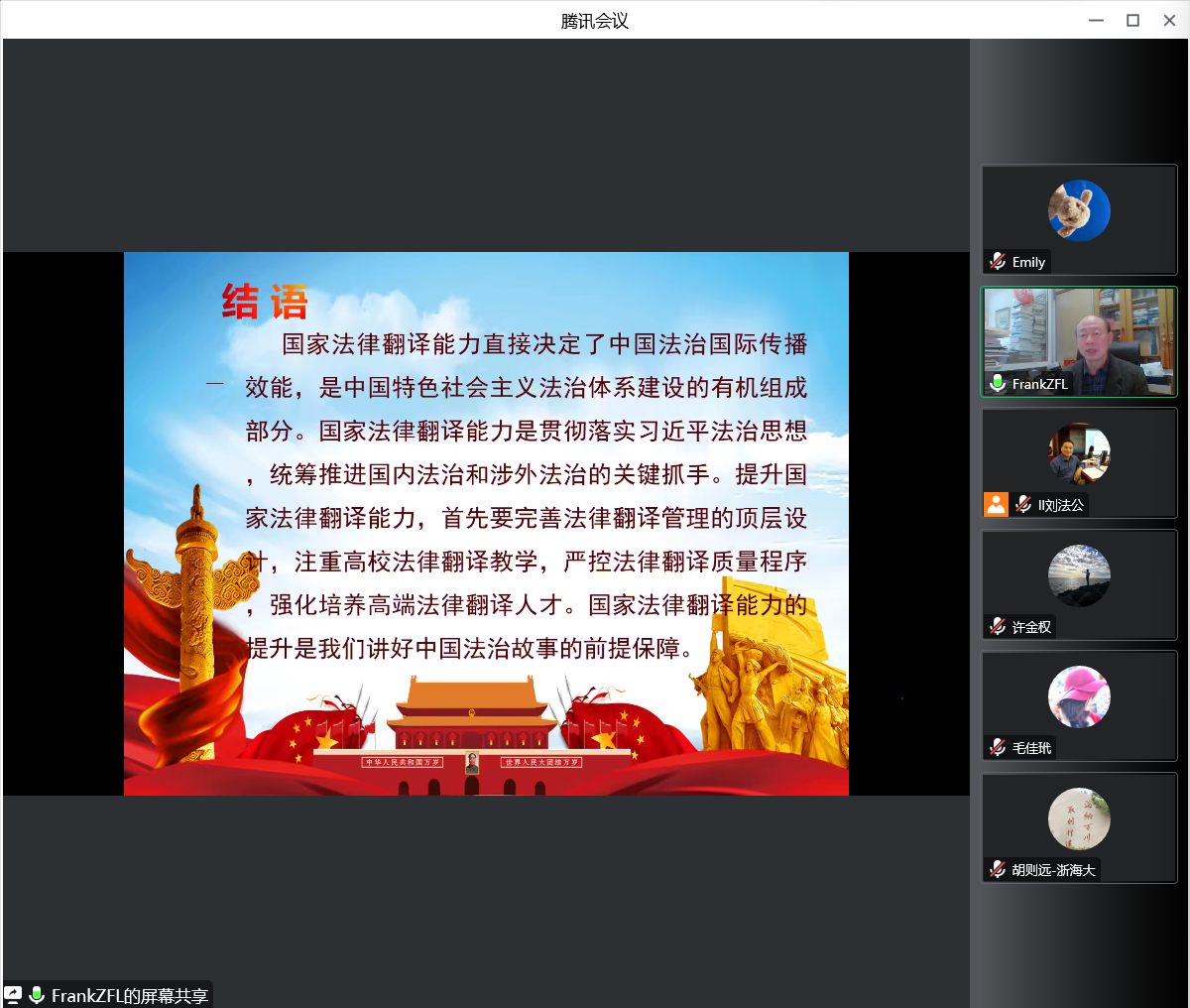 龙磊博士在总结陈述中指出,提高国家翻译能力,能帮助我们厘清海洋法律研究和实践方面的问题,进一步解决法律翻译研究缺乏目标的问题,深刻理解好国家战略的内在联系,从而与国家发展相结合。