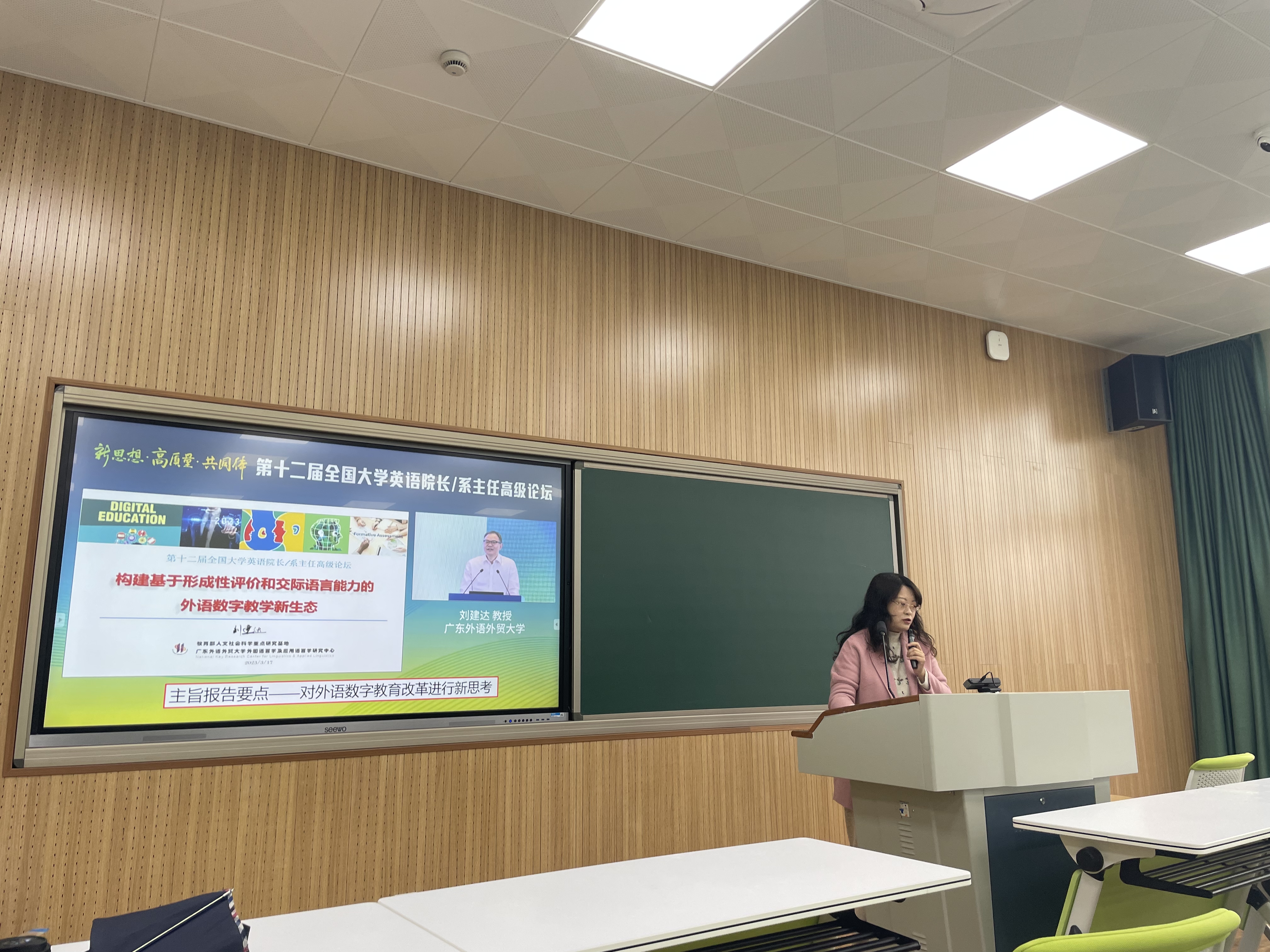 朱巧蓓老师详细解读了广东外语外贸大学刘建达教授所做的题为“构建基于形成性评价和交际语言能力的外语数字教学新生态”报告,引领教师们从党的二十大精神、新文科建设、课程思政、高校教育教学“新生态”以及新时期外语教育评价改革等新背景对外语数字教育改革引发了新的思考。