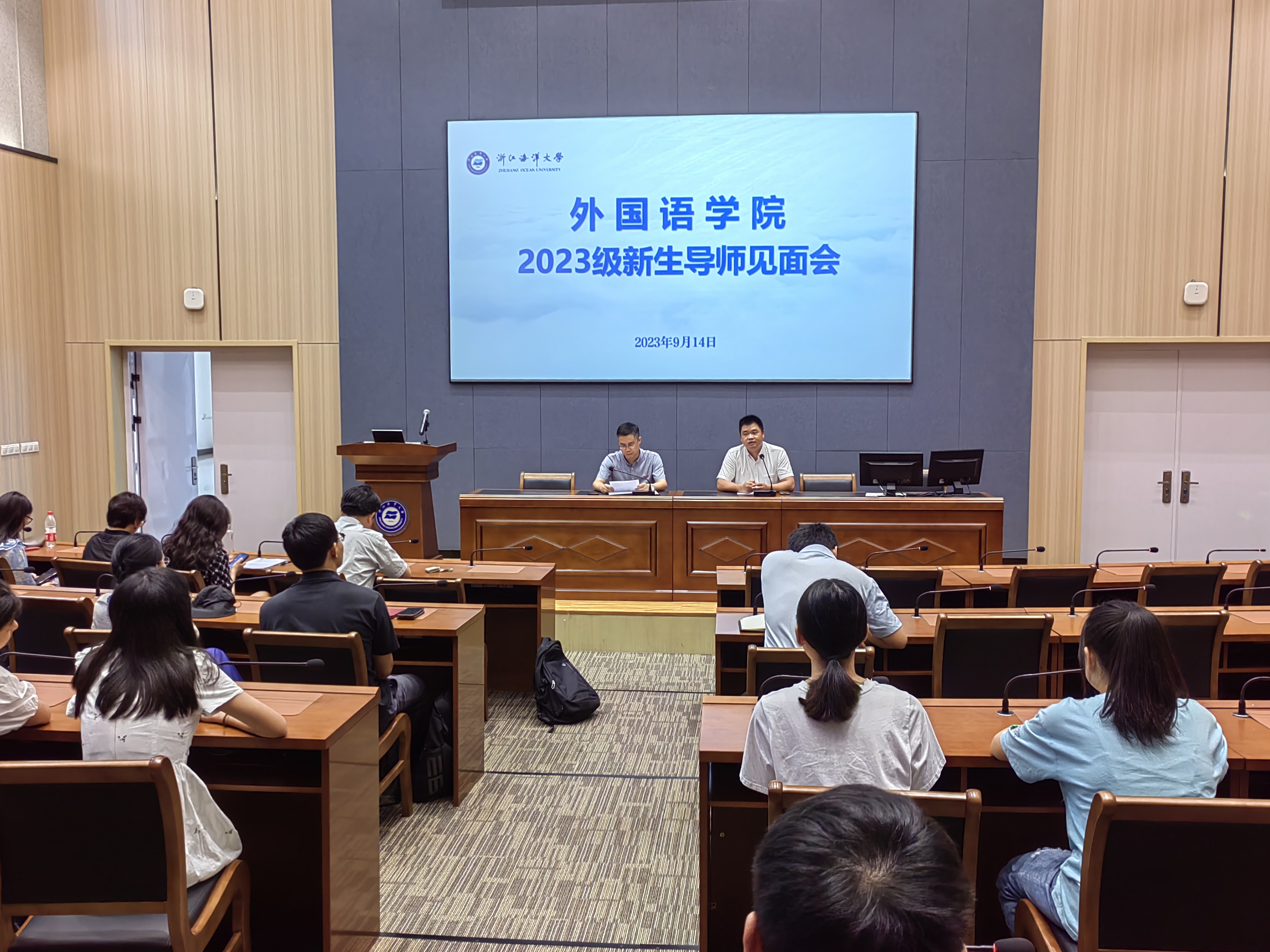2023级学科教学(英语)专业研究生导师见面会在新城校区举行,学院党委书记金武州出席见面会并讲话,全体硕导和2023级学科教学(英语)专业研究生参加会议,学院院长助理向鹏主持见面会。