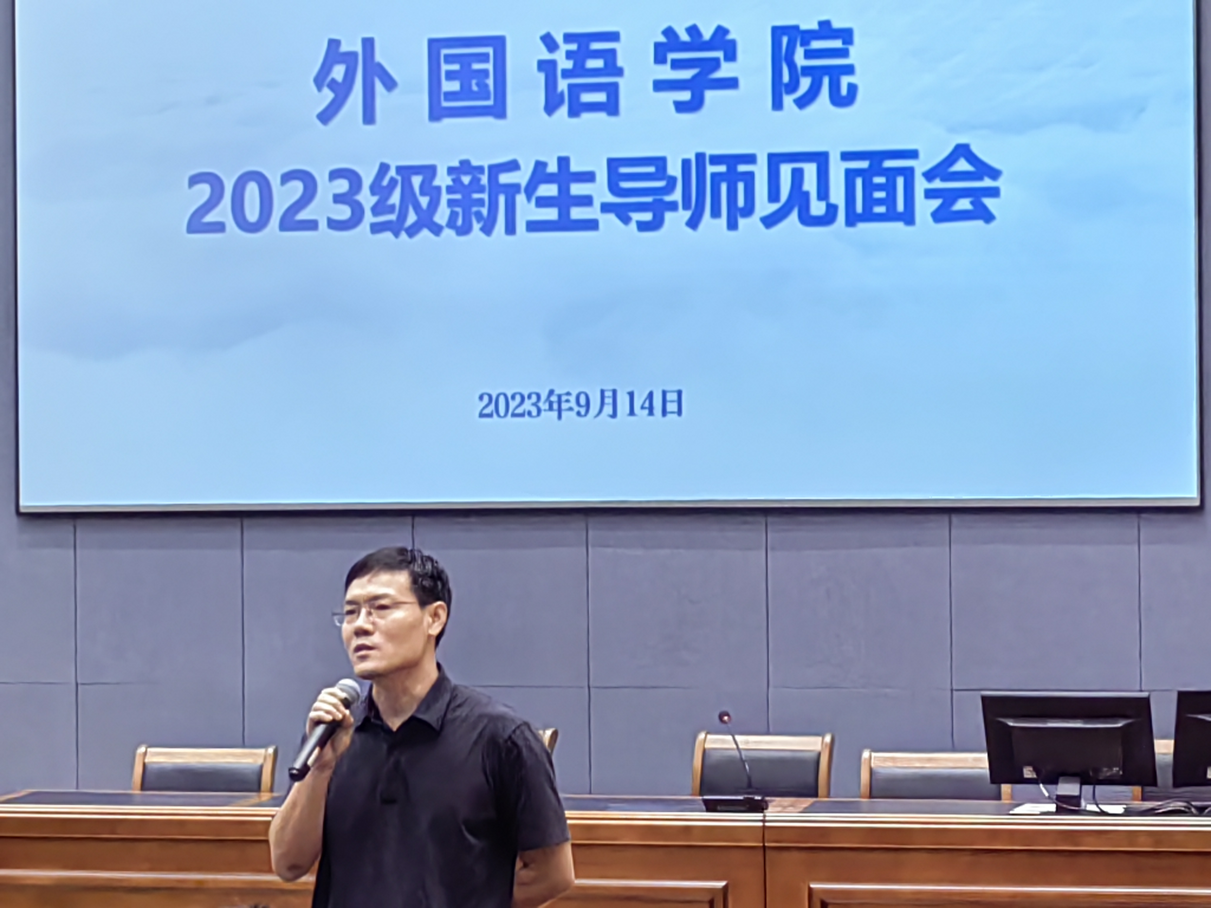 金武州书记首先对全体研究生新生加入外国院学院表示热烈欢迎,介绍了当前人工智能冲击下外语专业教育所面临的形势,鼓励同学们坚定信念,坚实信仰,并提出三点希望与要求:一是要树立远大理想,发挥主观能动性,培养有知识、有技能的人才;二是要努力培养创新精神,夯实专业技能,提升思维模式,成为适应岗位的高素质、高质量的复合型人才,课题研究要能够切实解决实际问题;三是要有坚定的爱国主义精神,要端正学术道德和思想品德。