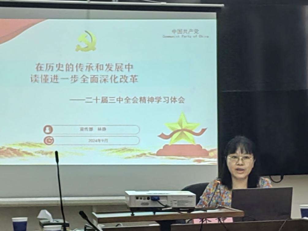 林静以《在历史的传承和发展中读懂进一步全面深化改革》为题,从党的二十届三中全会的历史定位、政治部署、理论创新和改革举措四个方面,全面深刻地解读了全会的精神和内涵,并指出全会对推进中国式现代化具有里程碑式的意义,为学院教职工学习贯彻党的二十届三中全会精神做了辅导。