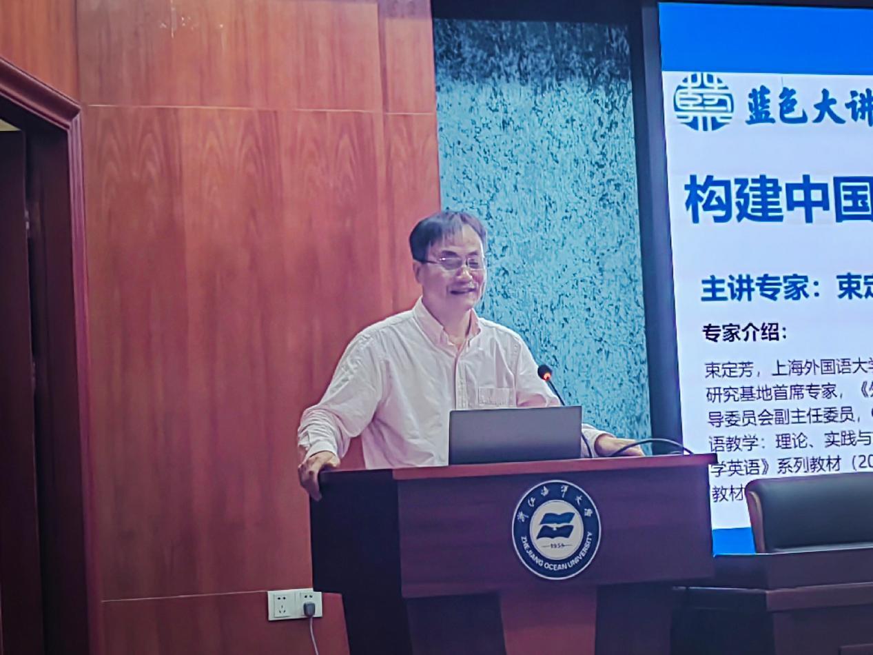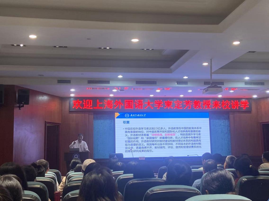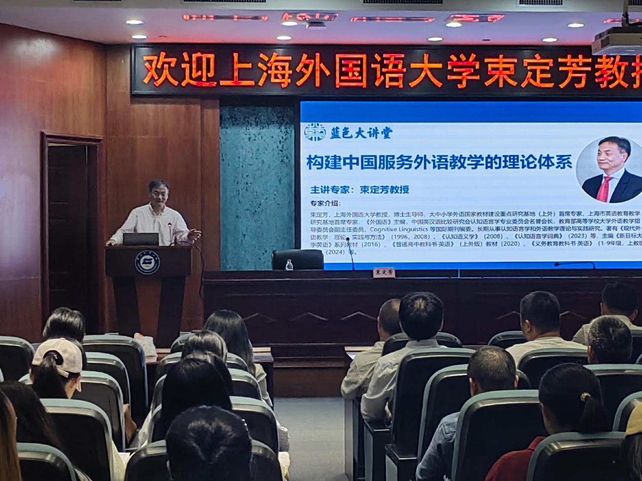10月16日,学院邀请上海外国语大学束定芳教授作题为《构建服务中国外语教学的教材理论体系》的蓝色大讲堂专题讲座,讲座由院长钟伟良主持,全体教师及教育硕士研究生参会。
