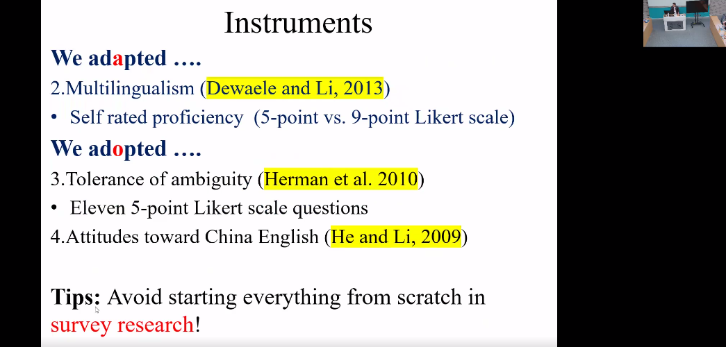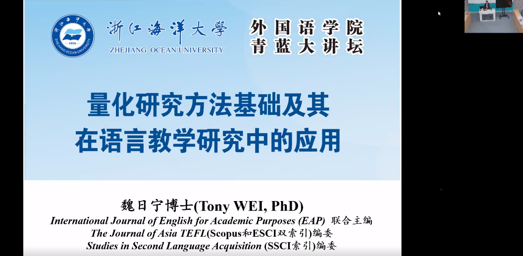 邀请西交利物浦大学魏日宁博士作题为《量化研究方法基础及其在语言教学研究中的应用》的专题讲座,讲座由英语系主任何泽教授主持,教师代表及全体教育硕士研究生参会。