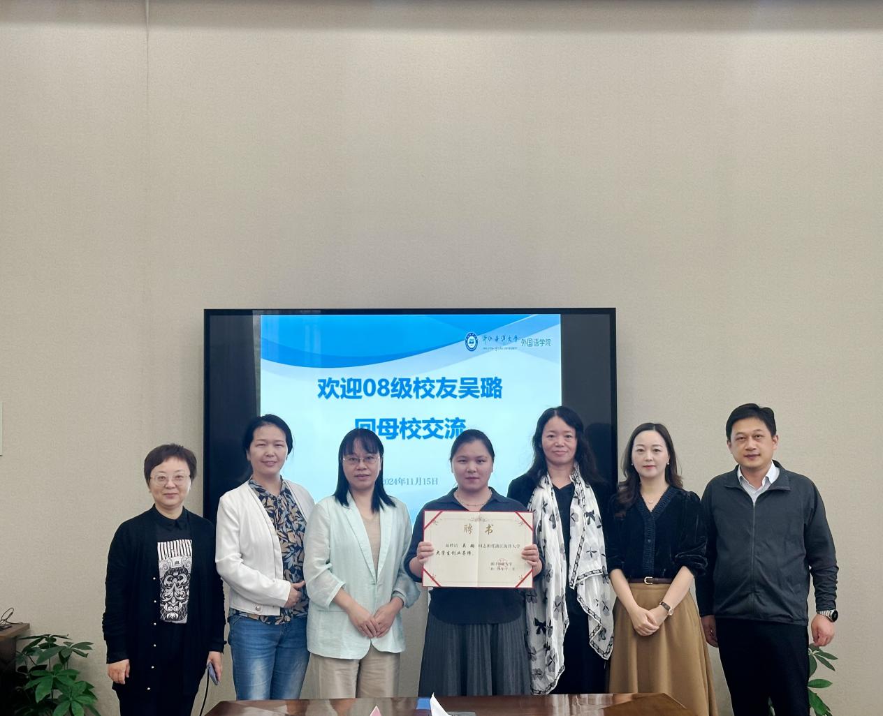 交流会上,林静向吴璐校友颁发学校大学生创业导师聘书,并向吴璐校友介绍了母校近几年的发展情况,重点介绍了学校成功更名大学和获批博士学位授权点相关情况。吴璐回忆了在校学习的精彩时光和毕业后的发展历程。吴璐根据自身经历认为,人工智能的兴起并不会对英语专业学生的就业造成挤兑,她希望母校能够进一步整合校友资源,为更好地推动学生就业、创业形成合力。与会人员围绕专业设置、大学生涯规划、校友会建设、毕业生就业等内容开展了深入交流。
