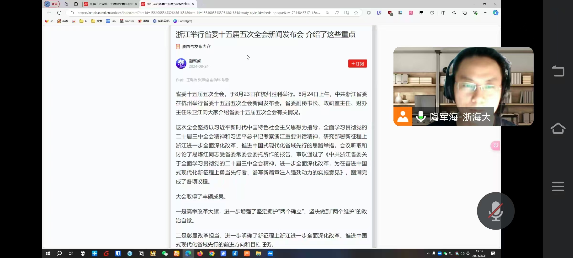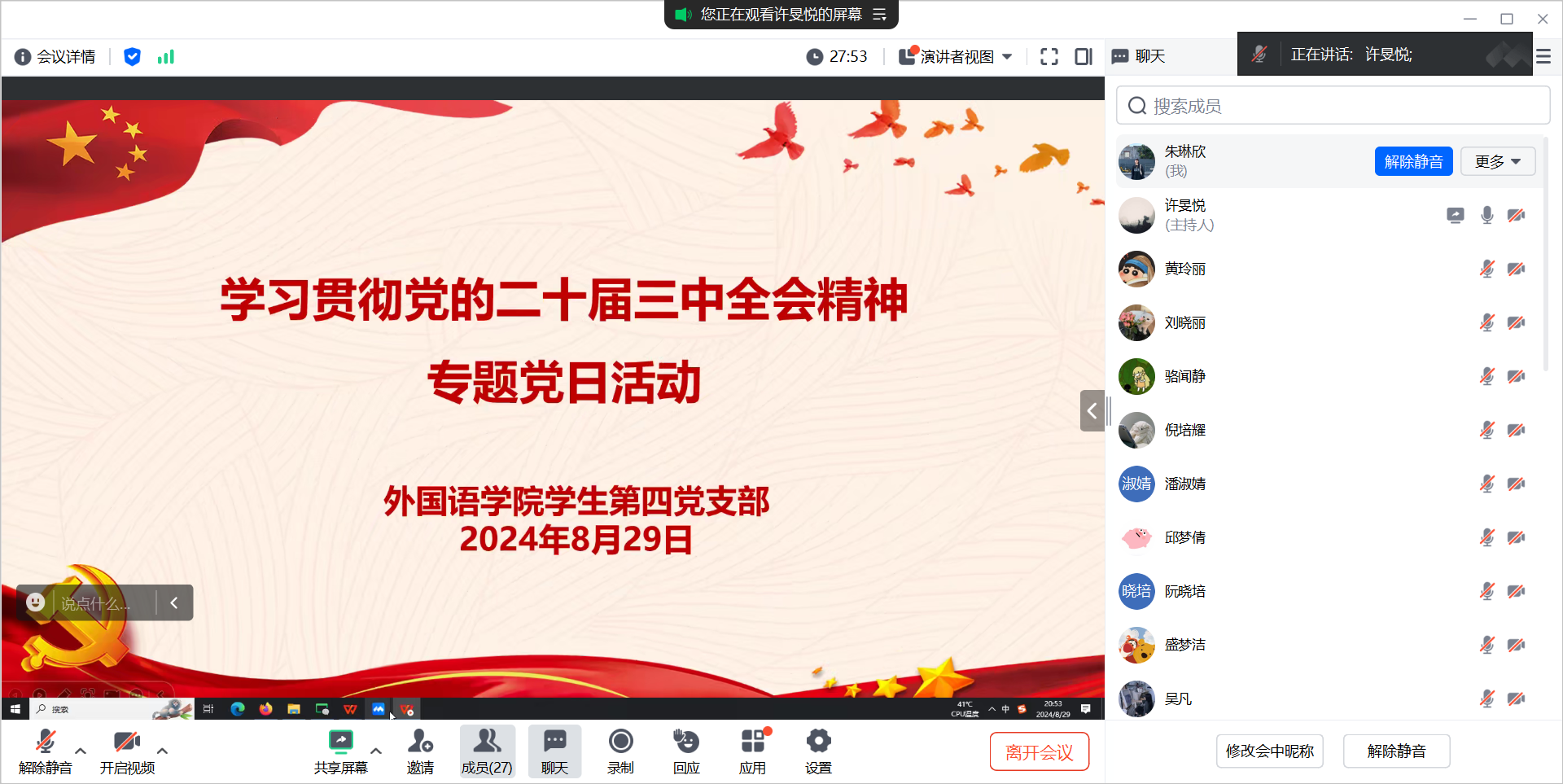 因正值暑期,学习活动以在线方式进行。党员们集体学习了党的二十届三中全会决议和习近平总书记在全会上的重要讲话精神。各支部书记开展领学,积极阐释全会召开的里程碑意义,带领全体党员提高认识,强化学习自觉。支部党员们全员参与、认真学习、畅谈感悟。