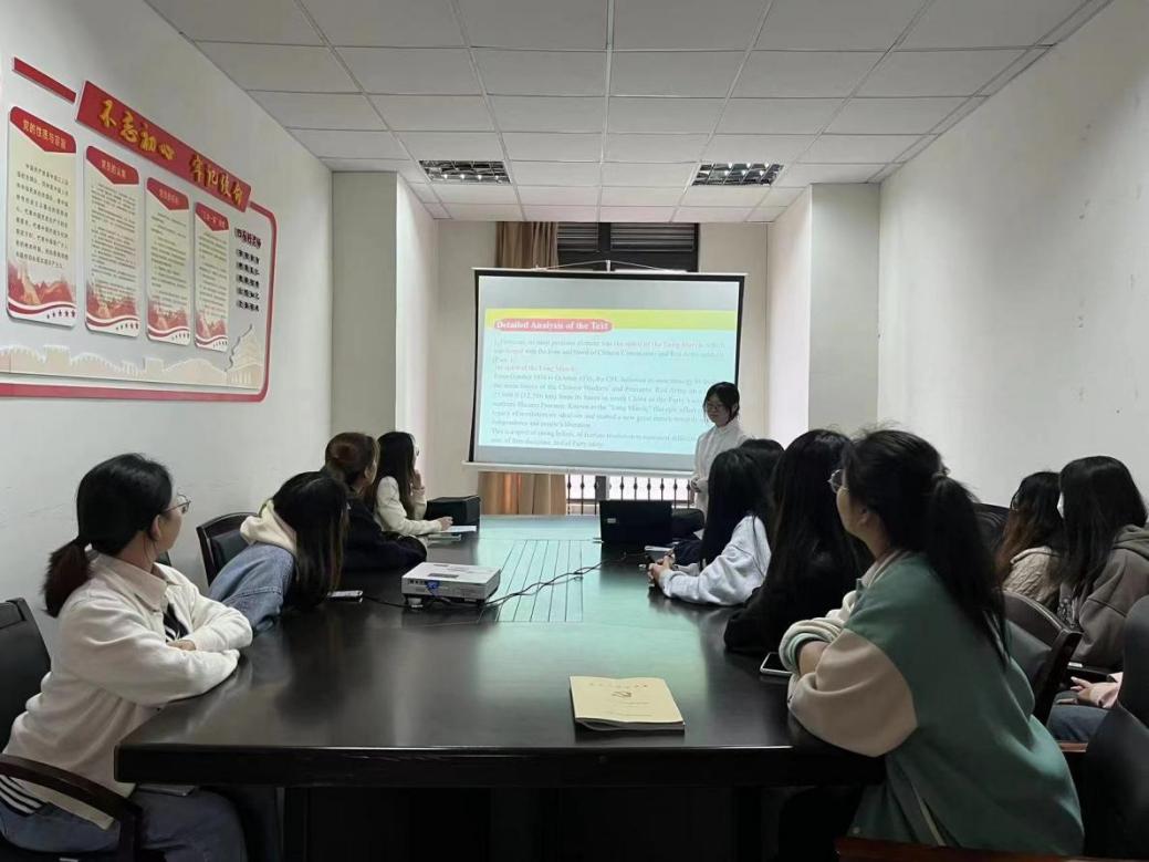 本次主题党日活动不仅引导学生党员读原篇、学原文、悟原理,提升党性修养和思政水平,又帮助师范生夯实专业基础和双语教学实践能力,熟悉政治方面的专业术语,提高语言表达能力。长征精神足印千秋,时代传承引导新路。本次活动利于党建与英语互融,同时为理解当代中国、传播中国故事打下坚实基础。