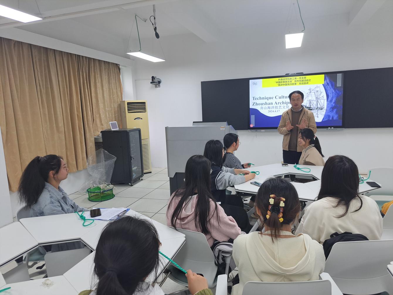 本期宣讲于4月17日举行,由教工第一党支部副书记毛佳玳老师主持,A22英语1班入党积极分子何莹莹主讲。首先,何同学讲解了海水采集、沉淀、浓缩、结晶等制盐过程以及煎煮、板晒、滩晒等舟山海盐制造技术。接着,她结合图像和视频,介绍了打结法、绞捻法、经编法等渔网编织技艺。为深化理解,毛老师随后展示了传统捕蟹工具——蟹笼,讲解了蟹笼的编织及捕蟹方法,并组织在场同学动手打渔绳节,在互动中传播海洋技艺的独特魅力。