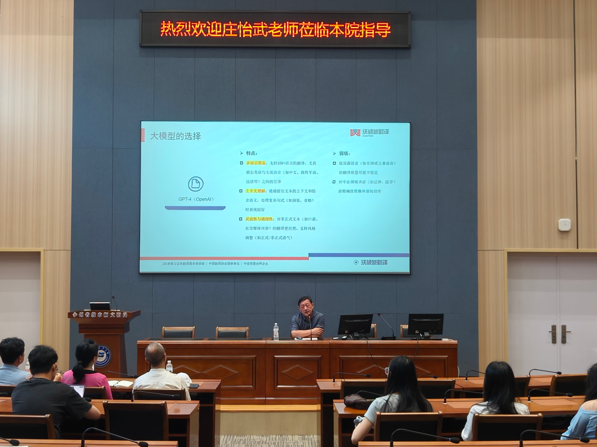 讲座上,庄怡武分析了传统翻译公司与现代翻译公司之间的差异,探讨了GPT-4、DeepSeek-R1、文心一言、DeepL Translator四种大模型各自的特点与弱项。重点介绍了大模型中的PROMPT应用,包括提示词设计六维框架与具体情境下的Prompt设计。讲座中,他还和大家探讨了过度翻译的典型表现,核心成因,以及解决方案与优化策略。