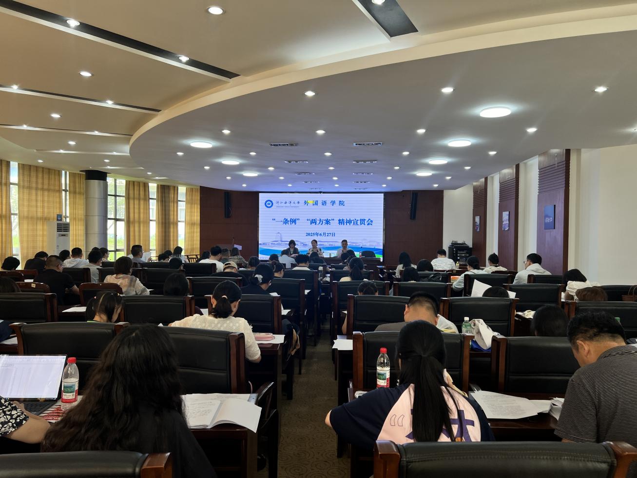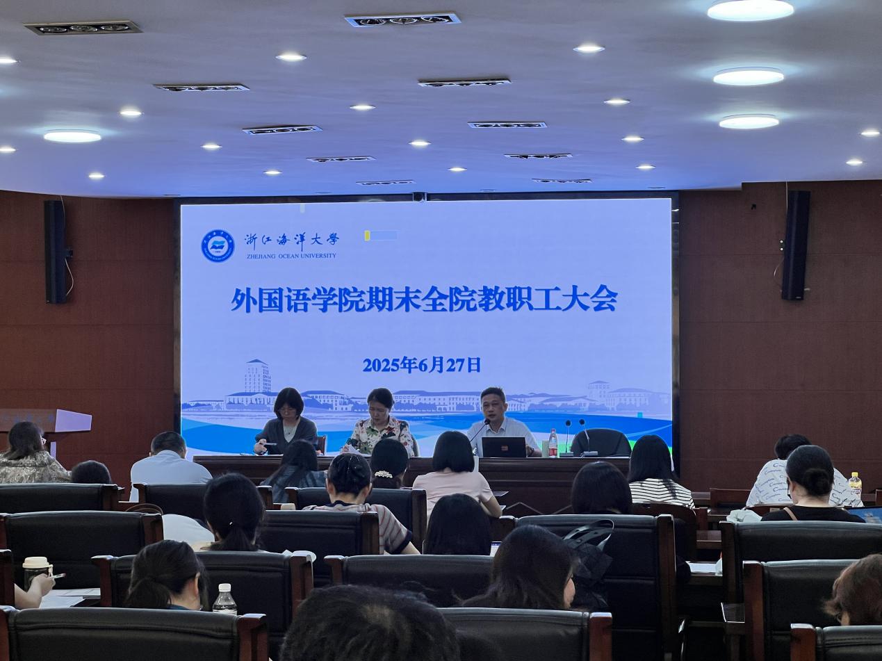 在定海校区活动中心一楼报告厅召开2024-2025学年第二学期期末全体教职工大会。学院全体教职员工出席。