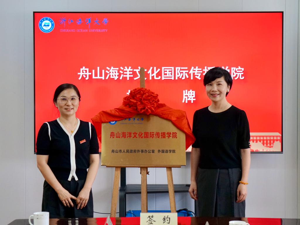 与舟山市人民政府外事办公室共同举办合作签约仪式,联合共建舟山海洋文化国际传播学院。市外办主任汤赛虹与学校教务处副处长张晓玲共同为学院揭牌。外办副主任庄海波、做爱视频