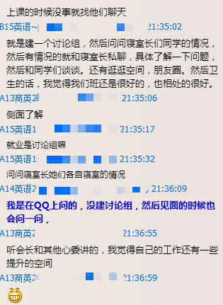 网络会议过程中,参会者借助语音与打字进行相互的交流。首先,会长对参会人员与召开本次网络会议的目的进行了简介。随后办公室成员对本次半月汇报表的汇总整理情况进行陈述,提出报表收集过程中的问题与相应的建议。接着,各班心理委员依次对报表的填写进行了反馈,并分享了自己在关注班级心理方面的工作经验:一般会建立寝室长讨论组进行相互沟通,平日里也会找寝室长或其他同学面聊。