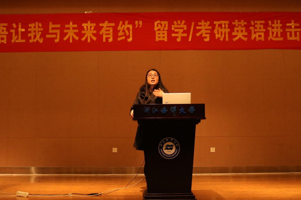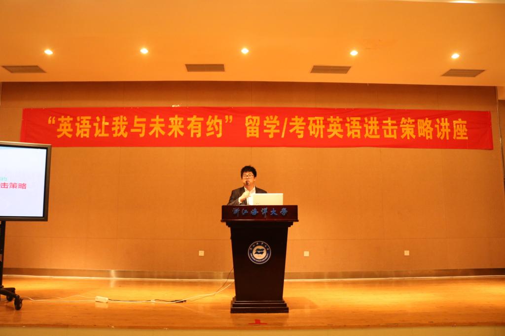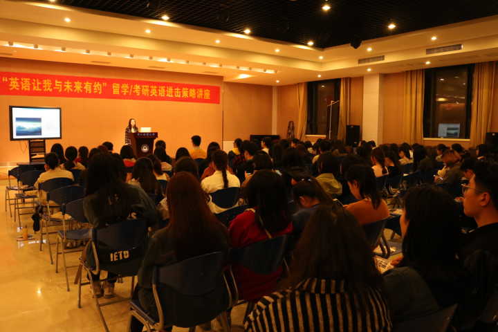 4月7日晚,“英语让我与未来有约”留学/考研的英语进击策略讲座在杨存国二号报告厅顺利进行。本次讲座由舟山“环球国际英语”的资深老师和上海留学顾问专家从留学申请,口语准备,备考技巧等几大方面,向同学们提供宝贵经验和建议。