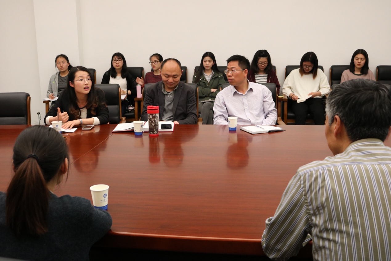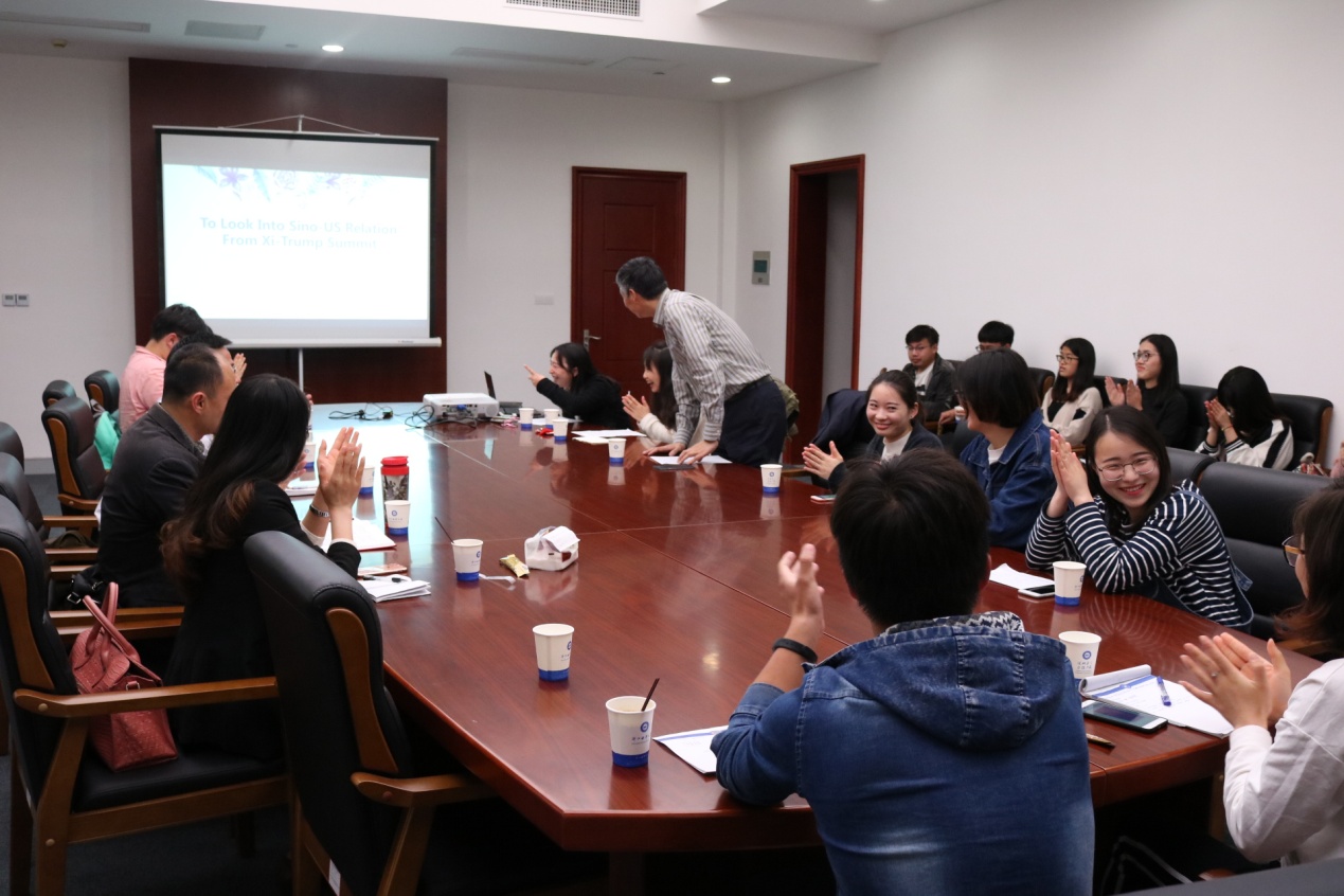 首先,余妮泽老师宣布开场并介绍到场来宾,接着邀请金枫老师简述了“习特会”的背景,这是自美国新政府就职以来中美两国元首首次面对面沟通,对中美关系的发展具有重要意义。接着与会人员畅所欲言,就“习特会”的主要内容、成果及意义进行了热烈讨论。最后周书记对大家的发言进行了总结,还以一个“从字母看习特会大事”的游戏加深了同学们对“习特会”的学习认识。
