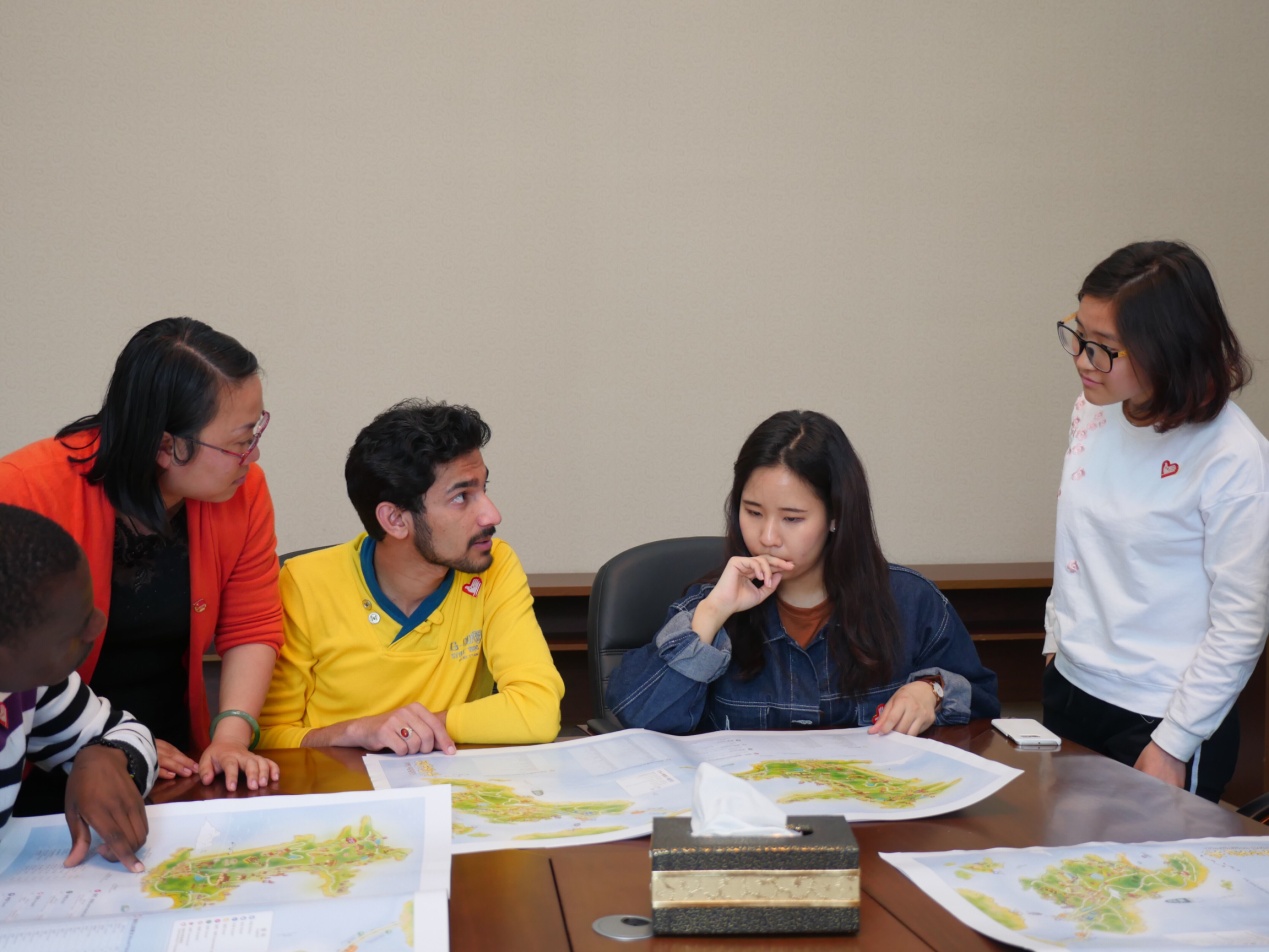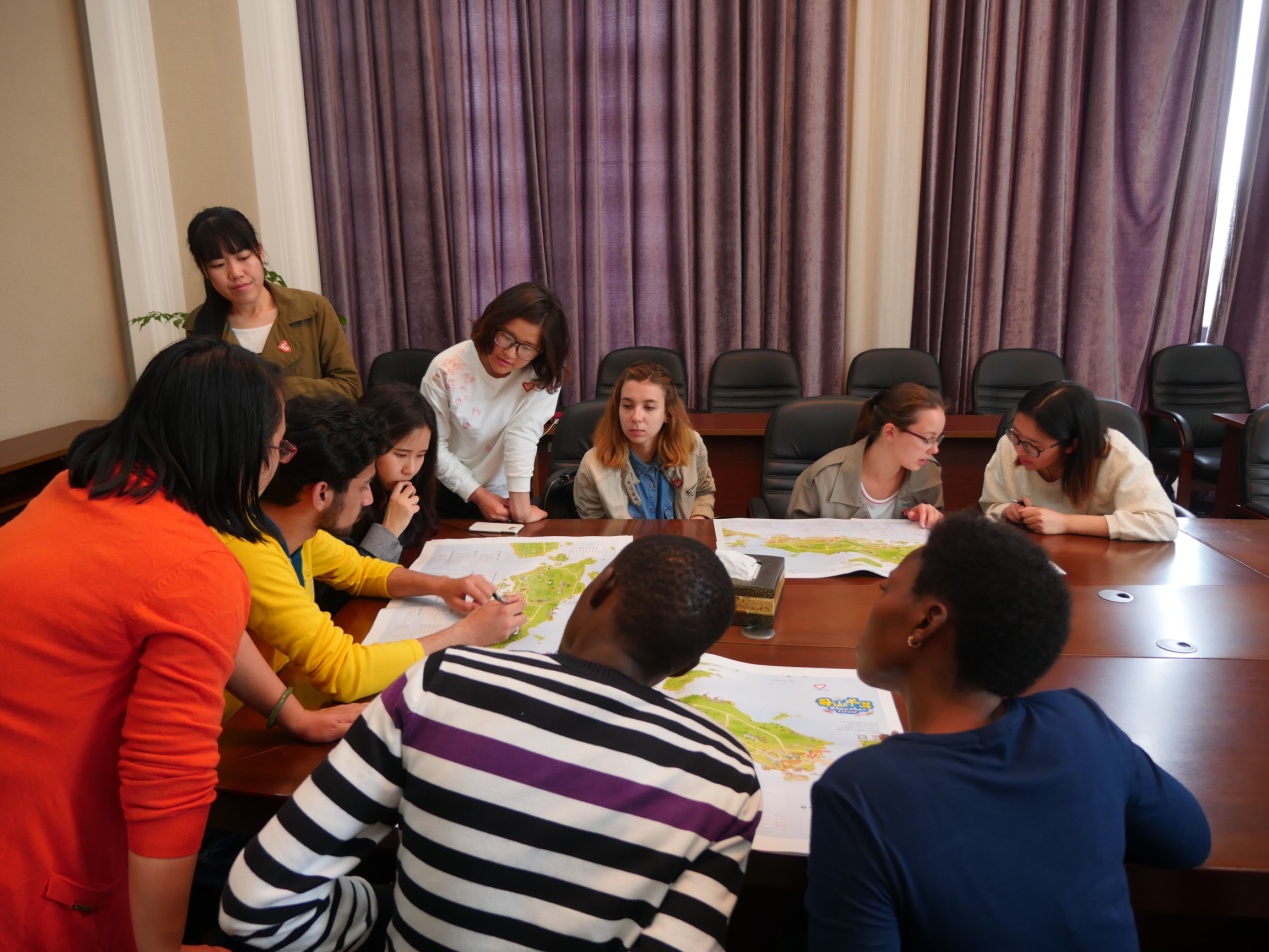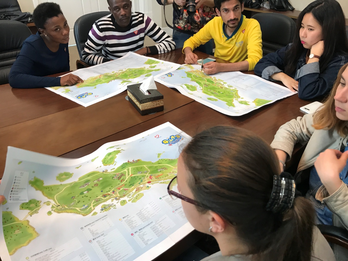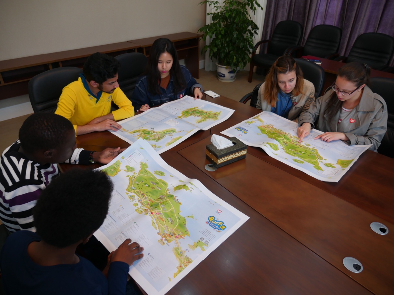 志愿者吕薇、钟莉芬全程陪同翻译。这份特殊的地图包括了舟山本岛、普陀和朱家尖岛,有汉语、英语双重注解,并增加了酒店、码头、景点等的详细注释。郑部长请留学生仔细观看,询问他们是否实用、符合他们的阅读习惯;志愿者与留学生们沟通交流,讨论地图上有哪些需要改进的地方及如何改进,并得到了积极反馈。