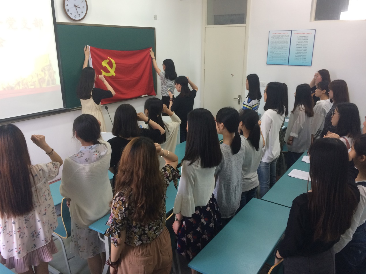 首先,主持人宣布会议开始。会议的第一项议程是接收预备党员。由钱瑜瑶、叶雨涵、寿丹妮、周瑶佳分别发表入党志愿讲话。每位同志的入党动机都十分端正,入党意向强烈。随后,由她们的对应入党联系人依次宣读入党积极分子考察情况,从入党积极分子的学习、工作、作风、入党动机等进行考察。紧接着,党员投票表决,通过了他们的入党申请。会议的第二项议程是预备党员转正。预备党员黄雯雯、於李佳、李珊、童唯纳、杨青依次宣读转正申请书,表达了坚定的入党意向。每位预备党员结束发表后由其对应入党联系人宣读转正考察材料,从预备党员的各方面情况进行考察。最后党员投票表决,通过了她们的转正申请。会议的第三项议程是全体党员,预备党员以及入党积极分子宣誓。全体同志面对着党旗庄严宣誓,表达了对党的崇敬。会议的最后,余妮泽老师发表了相关讲话与总结。