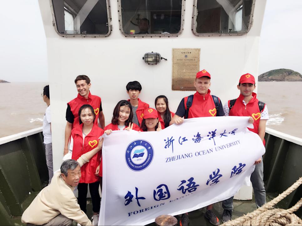 的五名志愿者协同三名外国志愿者前往五峙山开展国际志愿者鸟岛环保志愿服务活动,与外国志愿者一睹鸟岛风情,助力鸟岛保护。