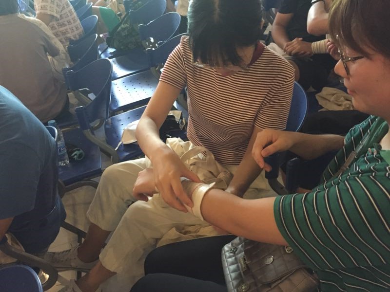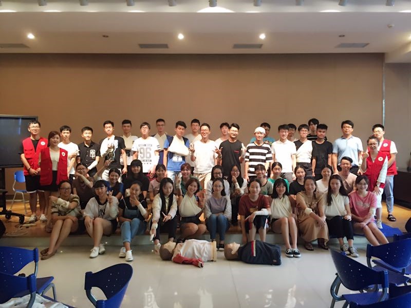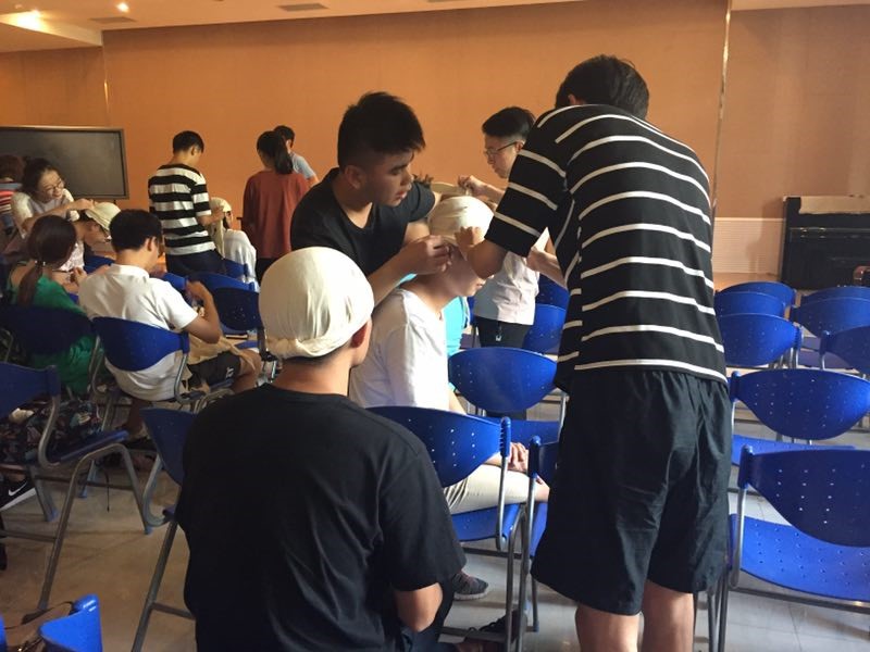 下午的实践操作中,俞老师首先让志愿者们两两组合,利用绷带和三角巾包扎手臂、关节、头部、手指等部位。包扎学习完毕之后,俞老师具体演示了一遍遇到有人突然昏迷倒地后的处理方法以及标准的心肺复苏动作。为了巩固要领,志愿者被分为四组,分别跟随四位红十字会成员,亲身体验整个过程。