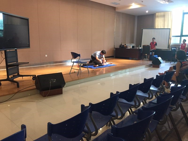 在上午的理论培训中,俞老师用了近三小时的时间,详细地向大家讲解了急救的四个重要步骤:评估、判断、呼救、救护。重点讲解了判断的要点和救护的要领:判断首先看意识,没有意识看呼吸,如果没有呼吸就要进行呼救和救护;救护方面,俞老师分别讲解当遭遇骨折、水电、出血、昏厥、昏迷、心脏骤停等情况时应如何应对,重点演示压迫止血法、骨折处理方法、复苏体位和心肺复苏等。